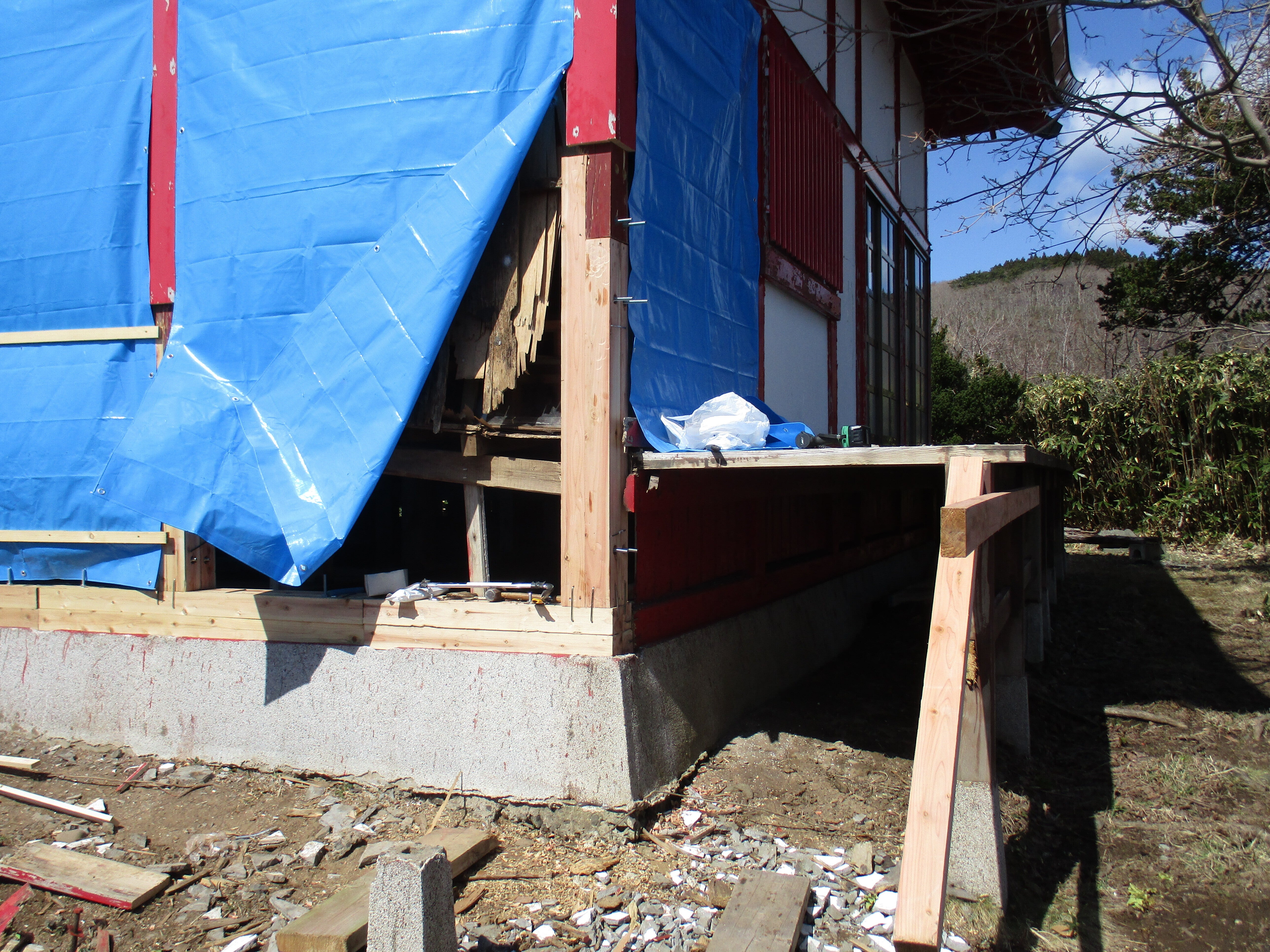 こんにちは!島の文化財の宮津弁天宮です。向かって右側の土台の修理の姿です、29日の写真です。有志の一人に任せた工事です。材料は有志15人で上げますが。4月には回廊の材料を1,5寸の3,6メートルを100本を手渡し方式であげますよ。工事の終わり次第古い材料の後片付けも一苦労ですよ。階段が120段もありますので。廃棄物なので。私も楽しく材料をあげています。これぐらいは出来ますよ。75歳の高齢者でも。明上雅孝。
