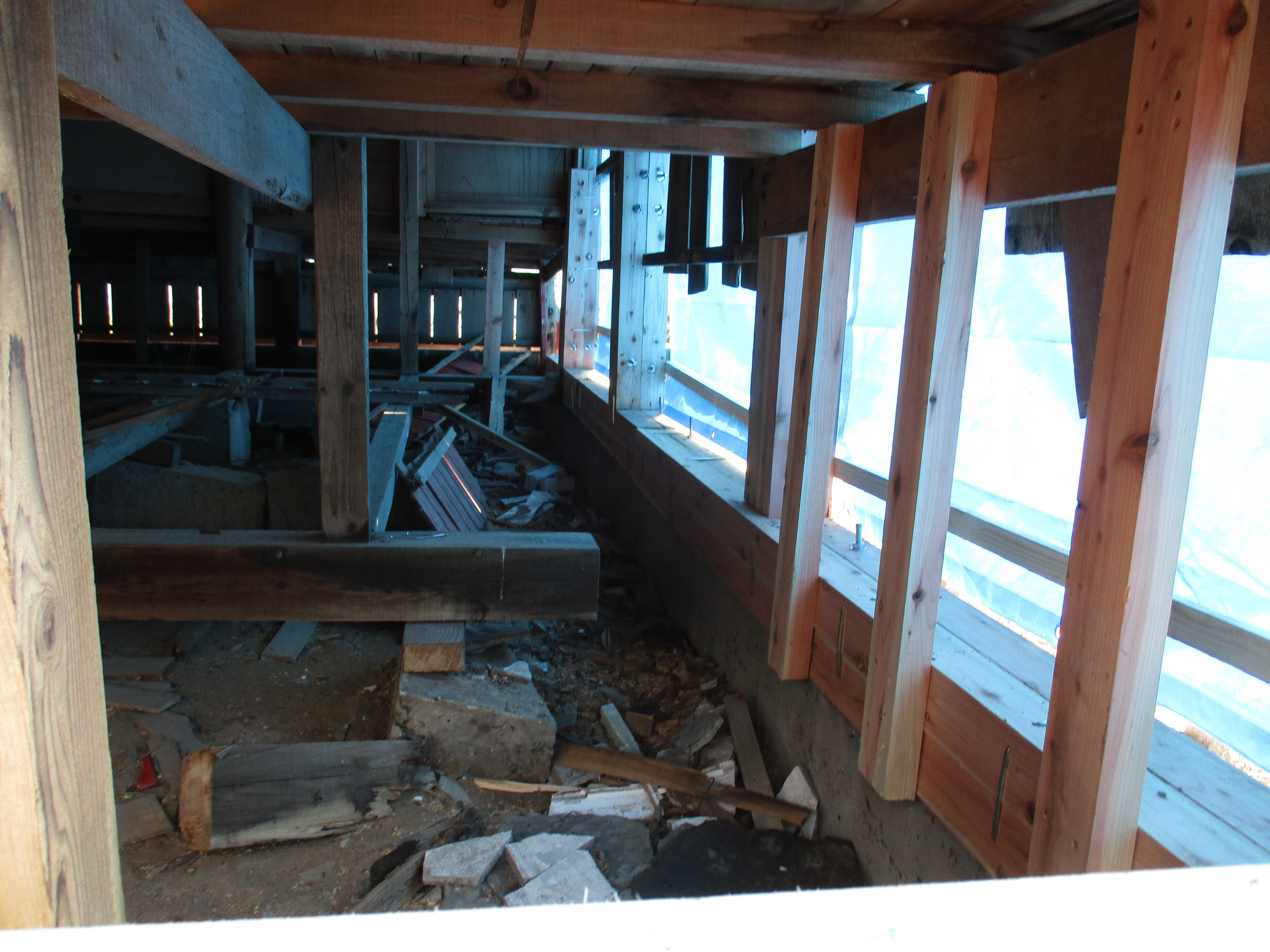 こんにちは!宮津弁天宮の横の土台も補修している姿です。柱も補修しています。この後に回廊の土台や手すりを作ります。周りが歩けるように。壁が最後です、最後は高級なペンキ仕上げです。期待してください。明上雅孝。