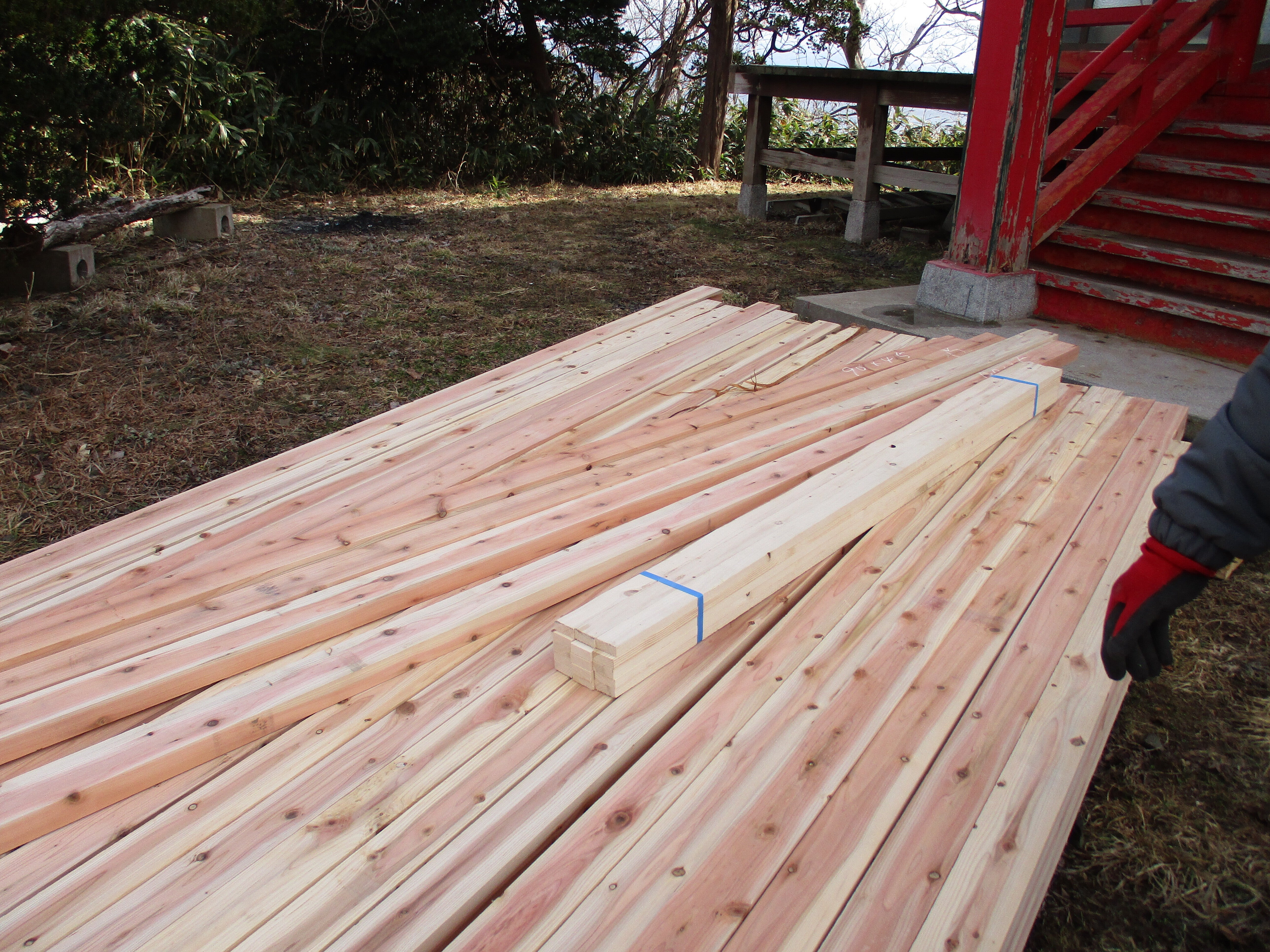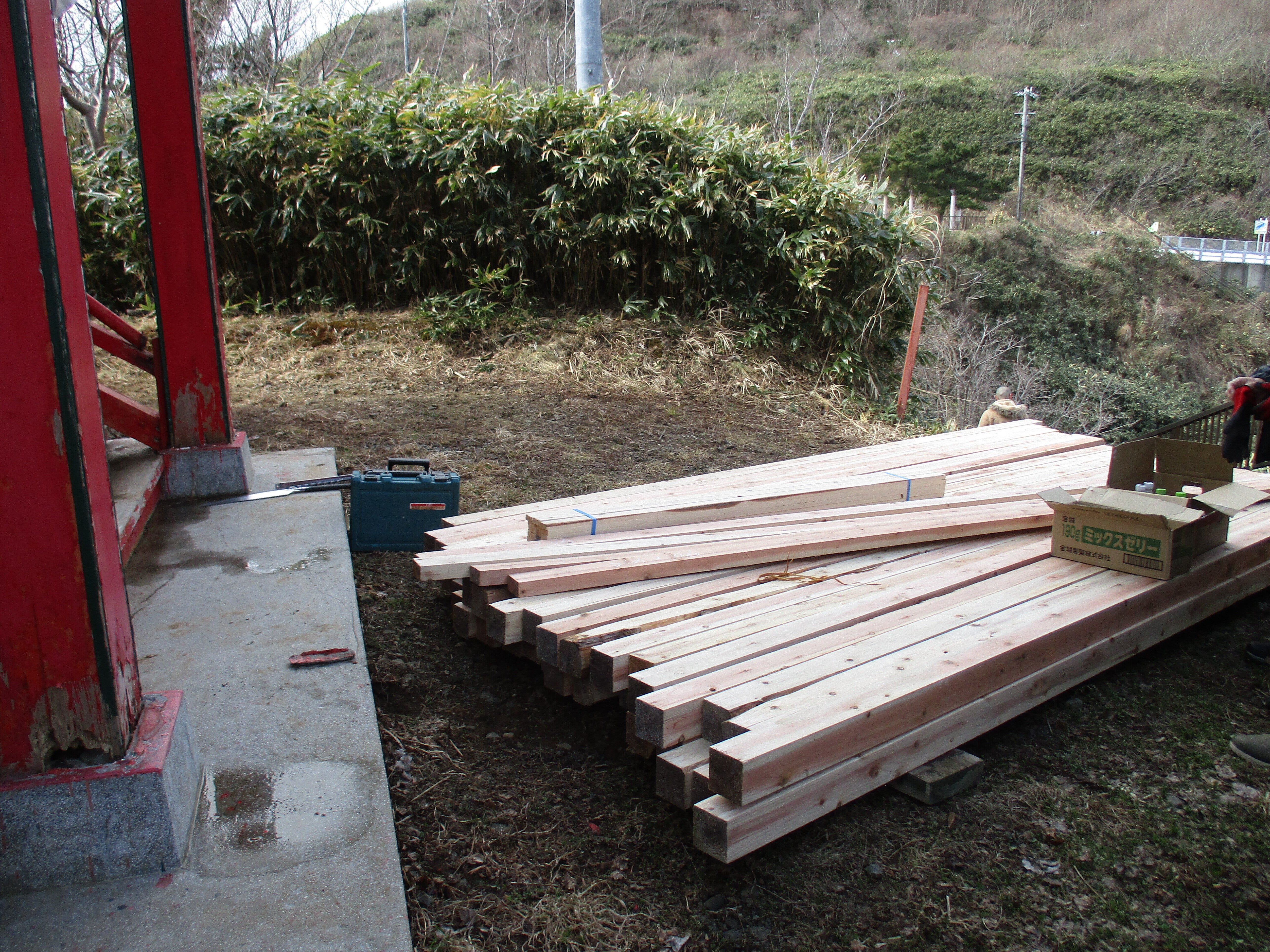 こんにちは!3寸の角材の1本3,6メートルの40本が無事宮津弁天宮に到着しました。ボランティアの15人のお茶も用意しました。島も雪も解けています。昔の人はこの位置に宮津弁天宮を建てた意味があったのですね。支援者に感謝です。島のボランティアにも。明上雅孝。15人で途中2回の休みでした。