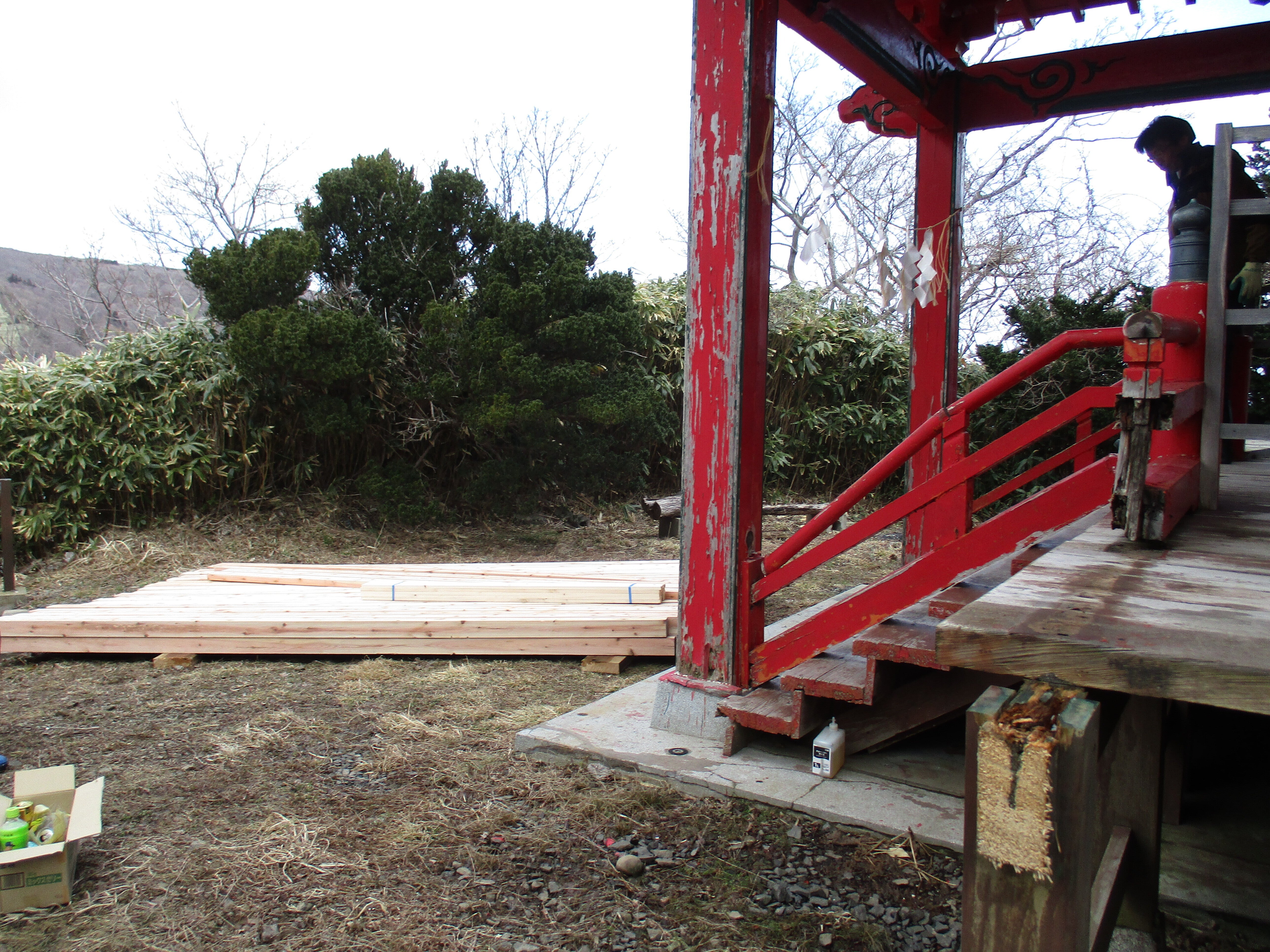 こんにちは!15日にボランティアの15人で途中2回休み、クレーンを使わずに人の手でリレー方式で3寸角の40本を宮津弁天宮に上げました。1本は3,6メートルです。島は雪も解けて工事が進みますよ。支援者に感謝です。090-5984-1384。明上雅孝。