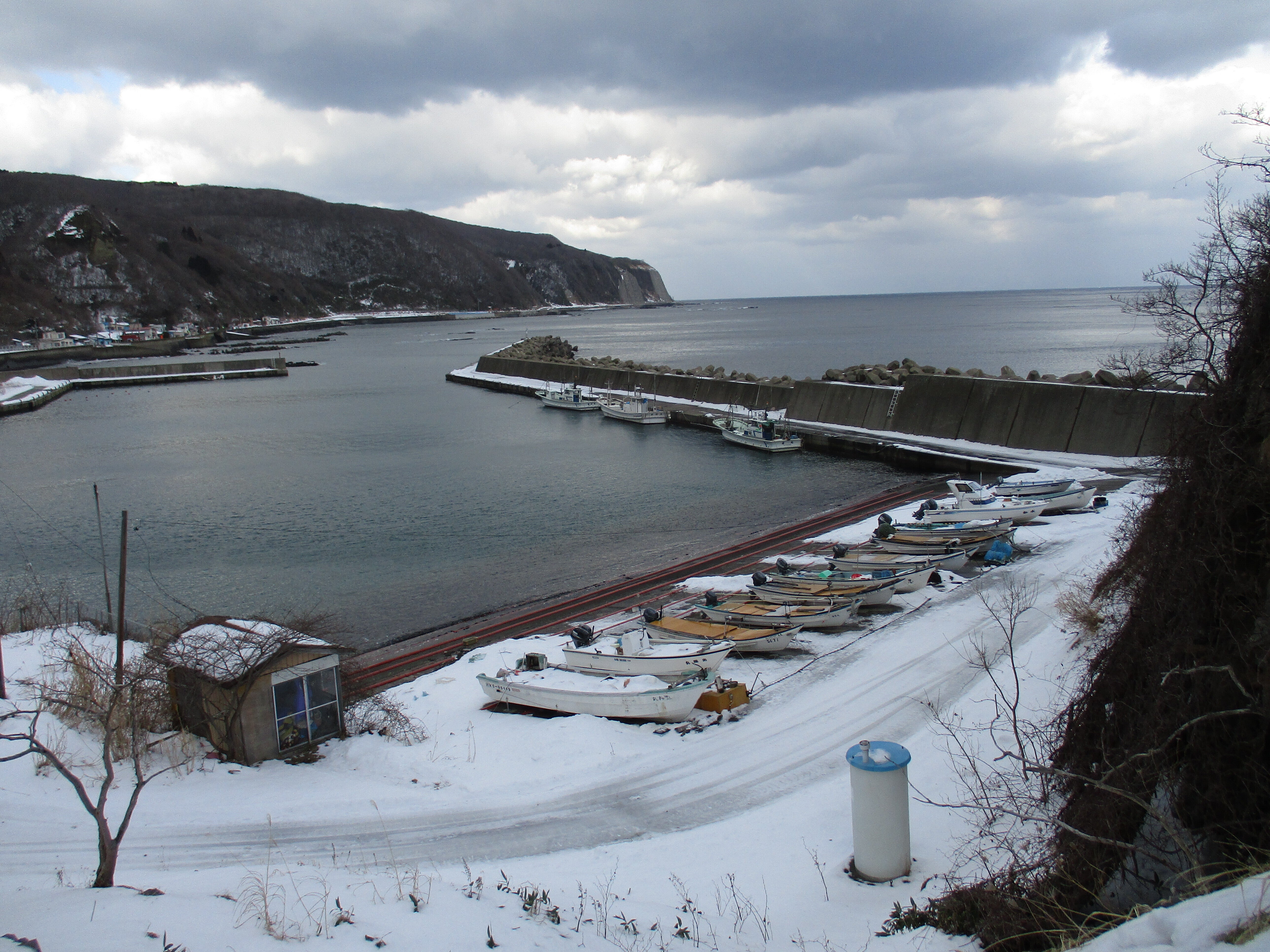 こんにちは!宮津弁天宮からの宮津港が見えています、イカ釣り船や、ウニ取りの小船です。部落も10戸ほどになりました。宮津弁天宮の維持も難しくなりました。支援者の力で今回の修理ができ感謝です。今は少しマスが取れています。サイズは小さいですが。明上雅孝。島はプラス2度です、雪も解けています。