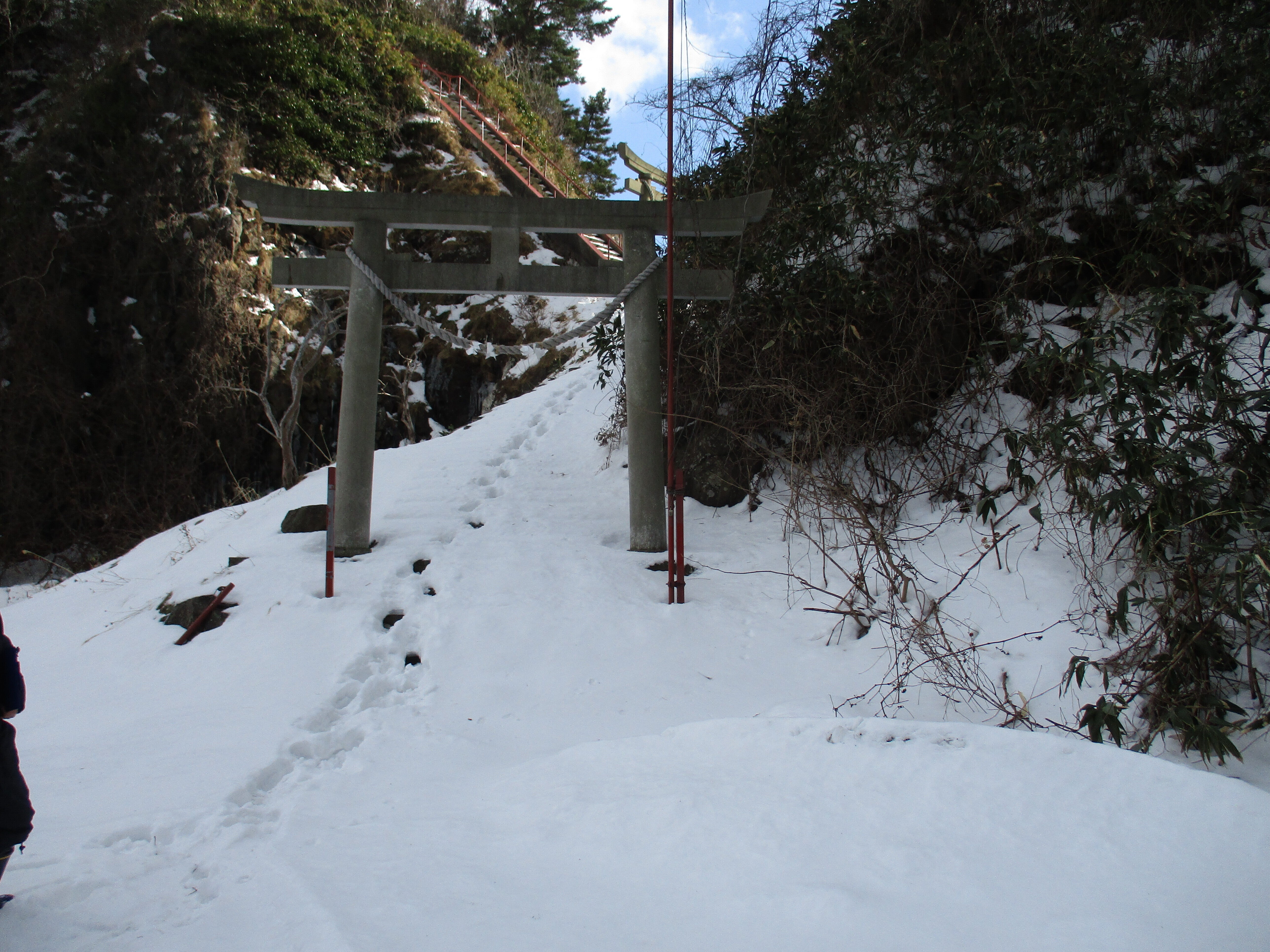 こんにちは!鳥居からの86段の手前の階段をもぼりますが、半分は急な勾配でした。雪がありましたので登山の雰囲気でした、人生で初めての経験でした。思い出深いものでした。完成したら感動の1ページになります。クラウドファンディングをやってよかったと。島の文化財の宮津弁天宮を後世に残せます。案内板に歴史を刻みます、支援者に感謝です。この階段を昇れたら何でもできそうです。090-5984-1384,明上雅孝。