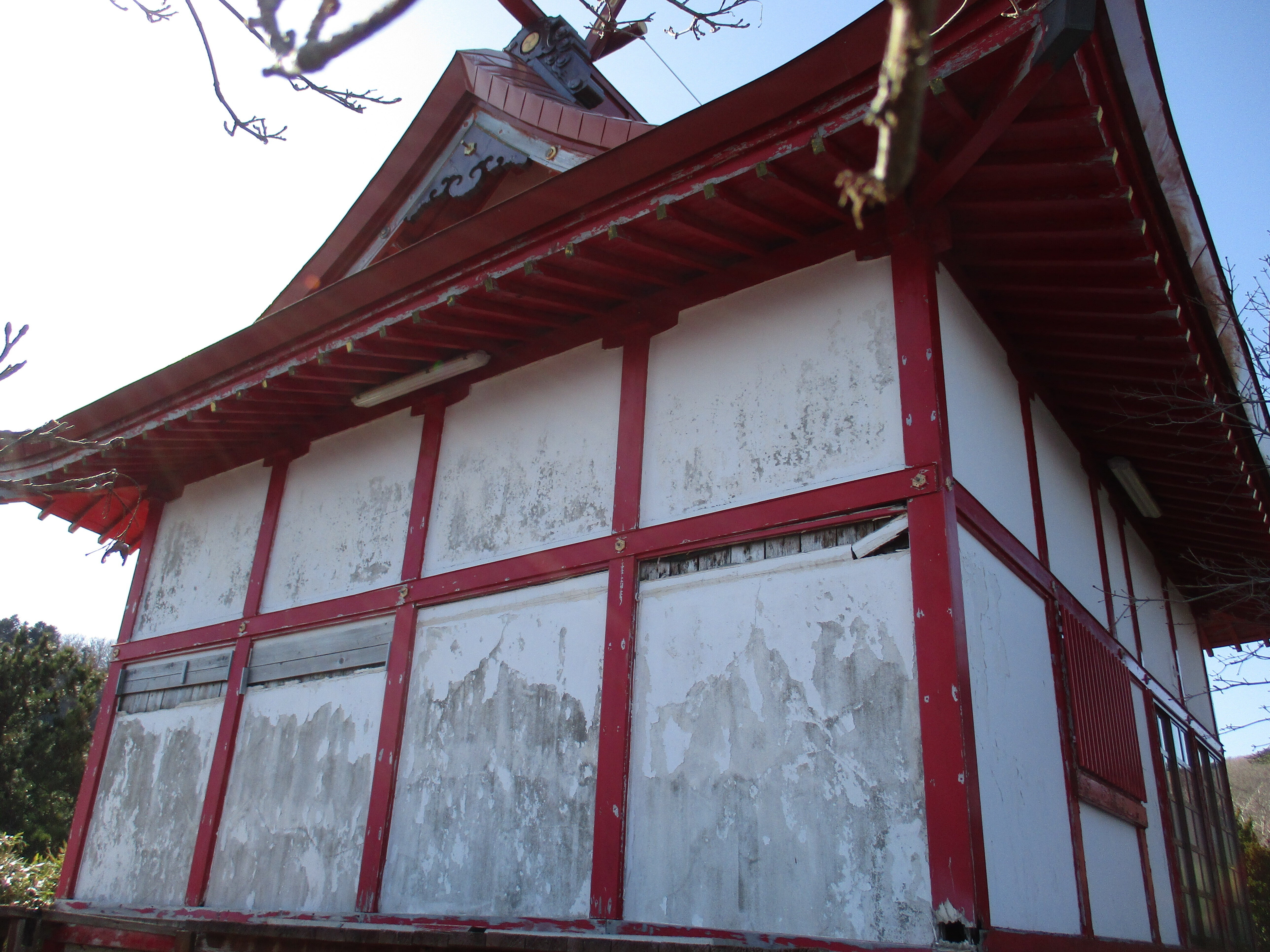 こんにちは!島の文化財の宮津弁天宮です。建設から55年です。島は塩害が強く外の壁が落ちています。工事の手を付けると壁は落ちるよと言っていましたので、壁の次が土台です。14日に寸法を図ります。材料は地元の杉も使います。製材所は、青苗に1軒あります。明上雅孝。