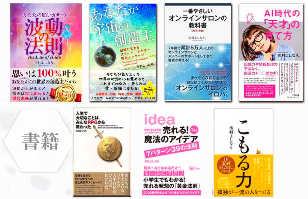 『波動の法則』(VOICE)『あなたが宇宙の創造主』(VOICE)『オンラインサロンの教科書』(ゴマブックス)『AI時代の「天才」の育て方』(きずな出版)『売れる! 魔法のアイデア 7パターン39の法則』(Clover出版)『人生で大切なことはみんなRPGから教わった』(バジリコ)『こもる力』(KADOKAWA)など多数出版することが出来ました。