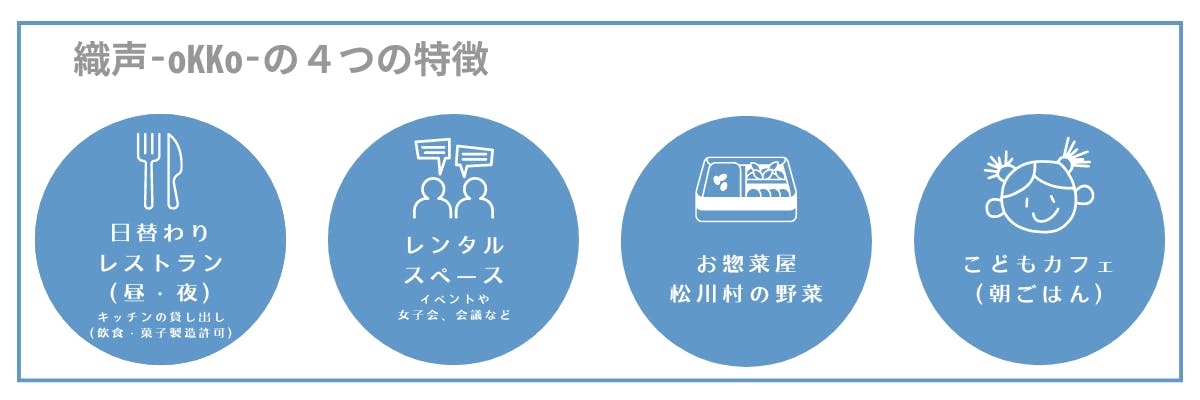 僕たちの作るまちの台所「織声 -oKKo-」では、大きく4つのことができる場所にしたいと考えています。