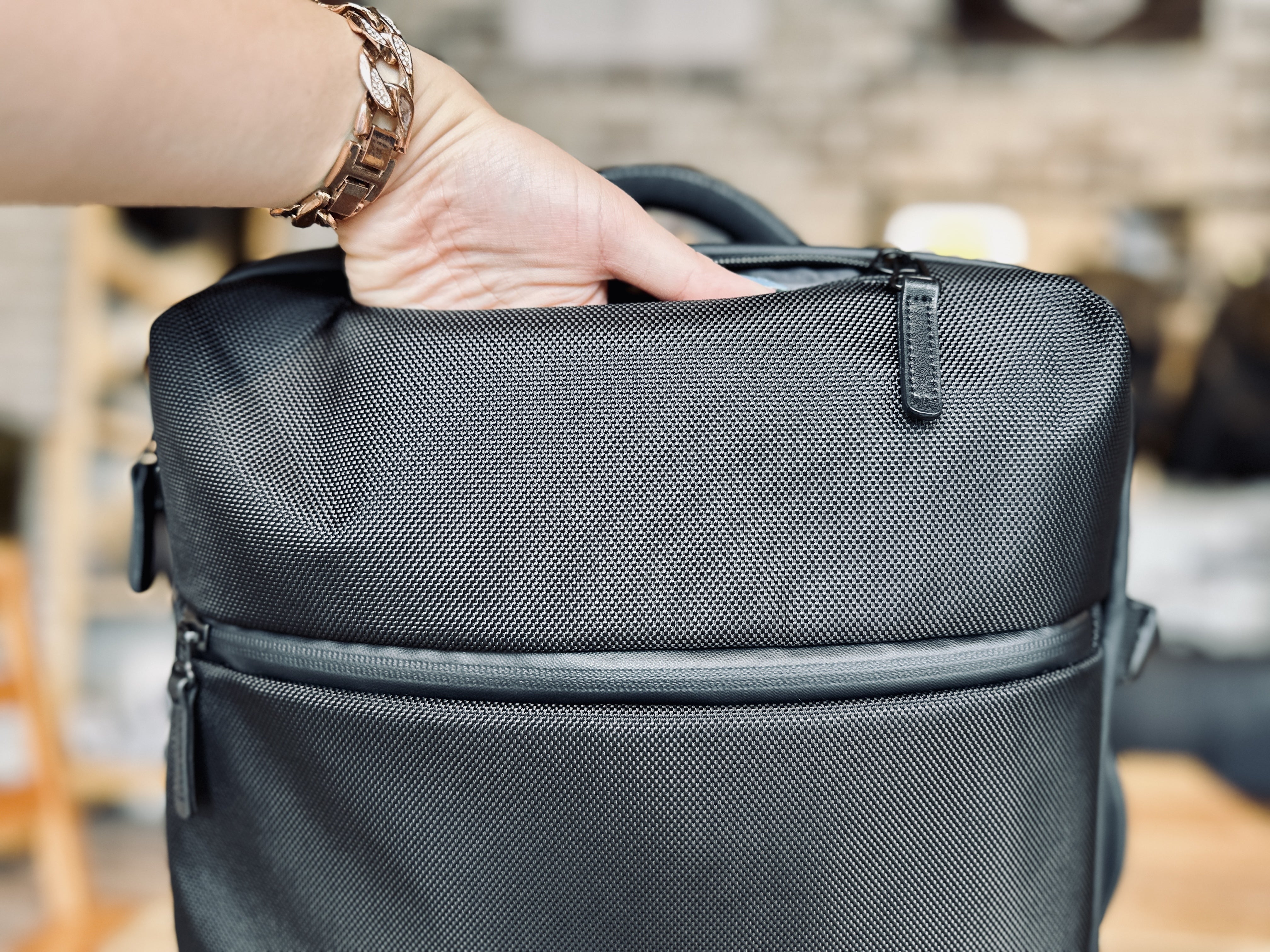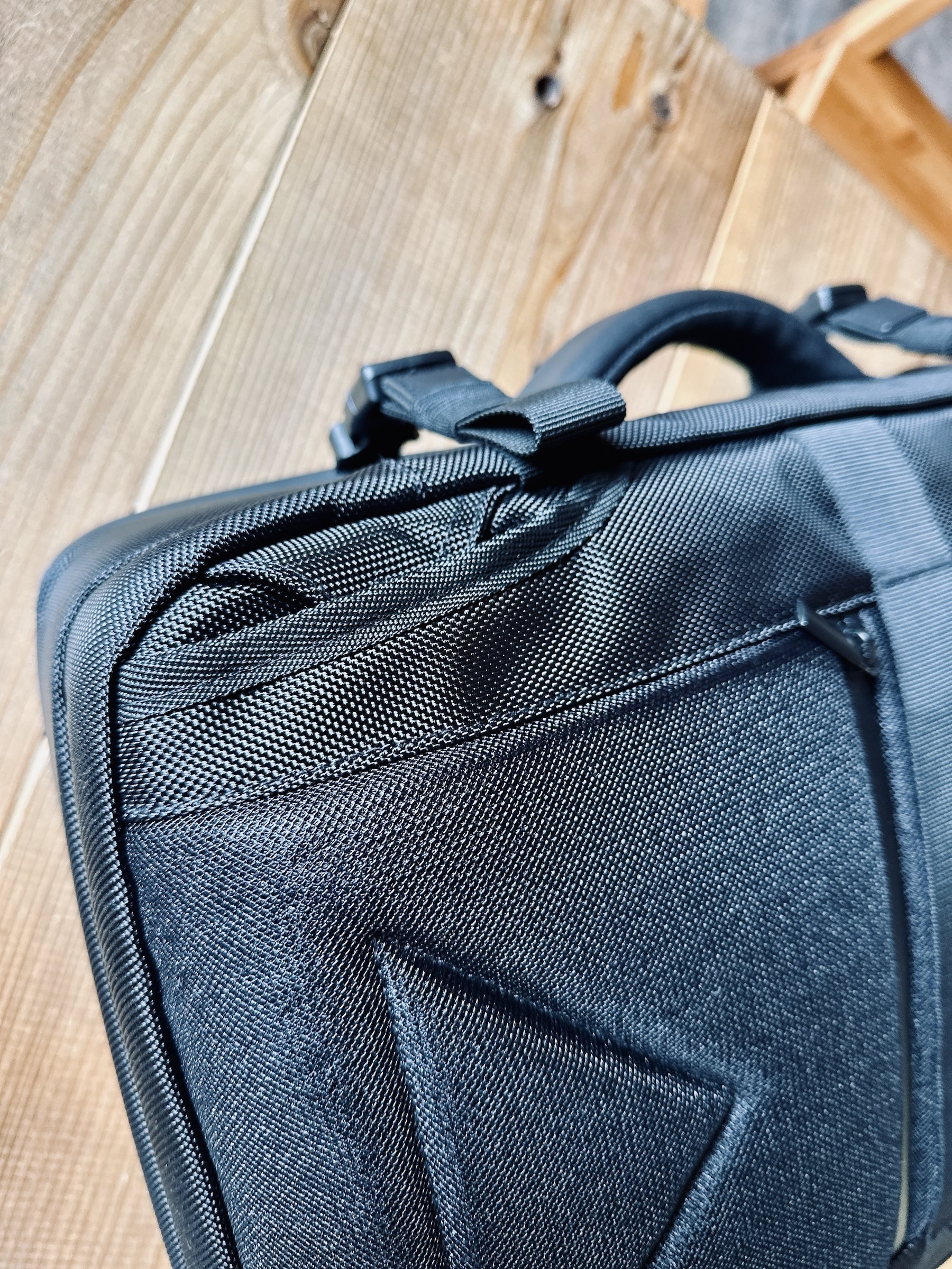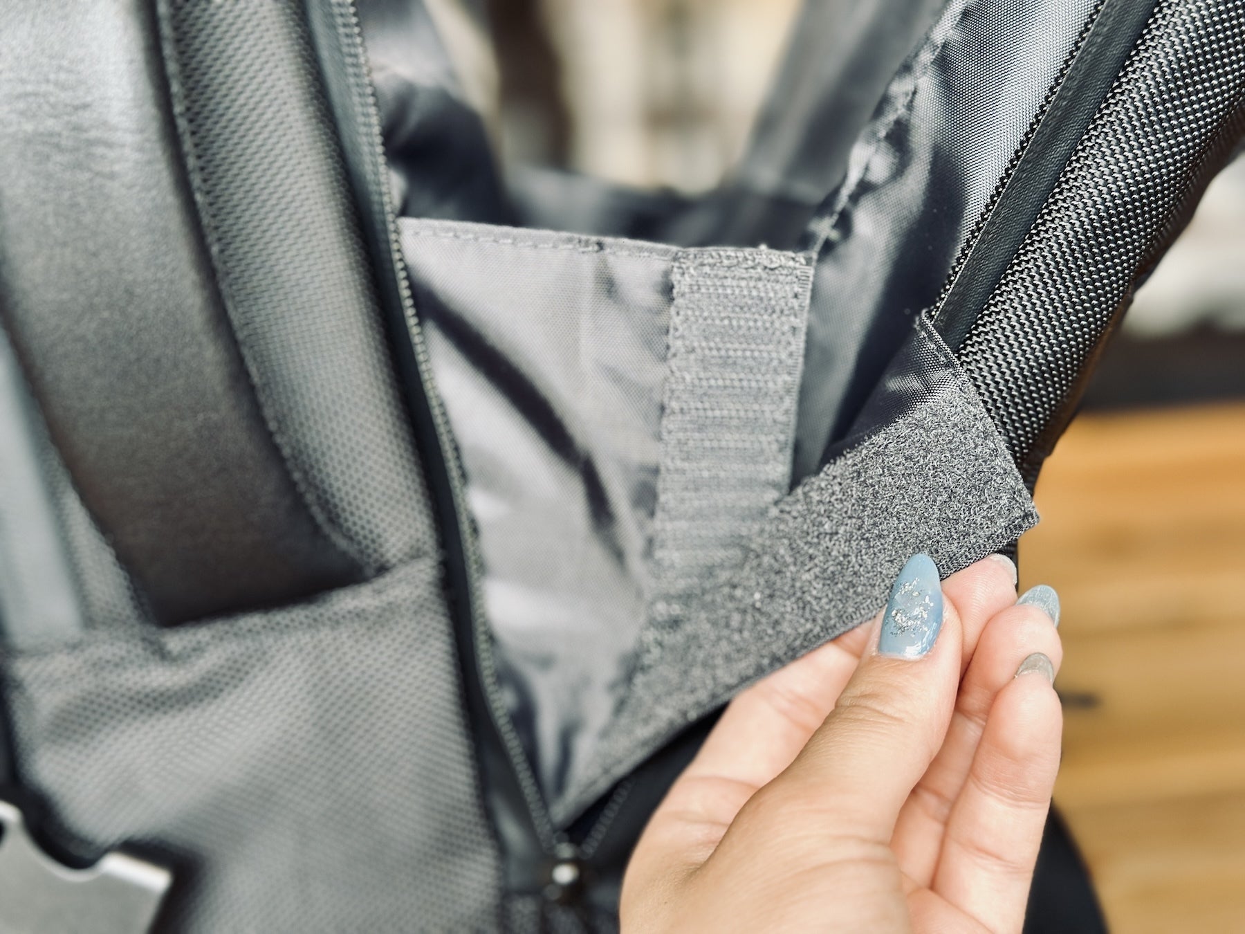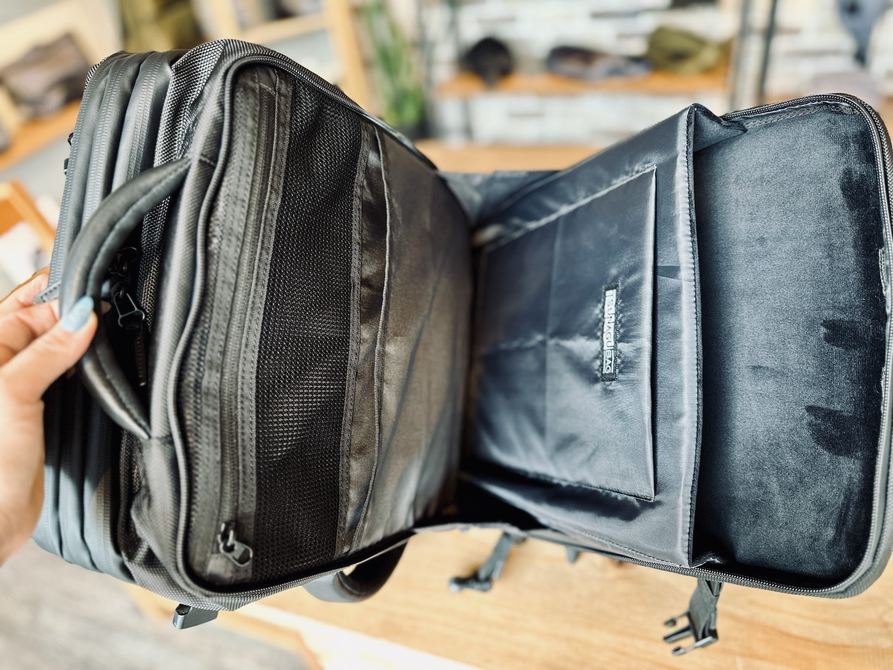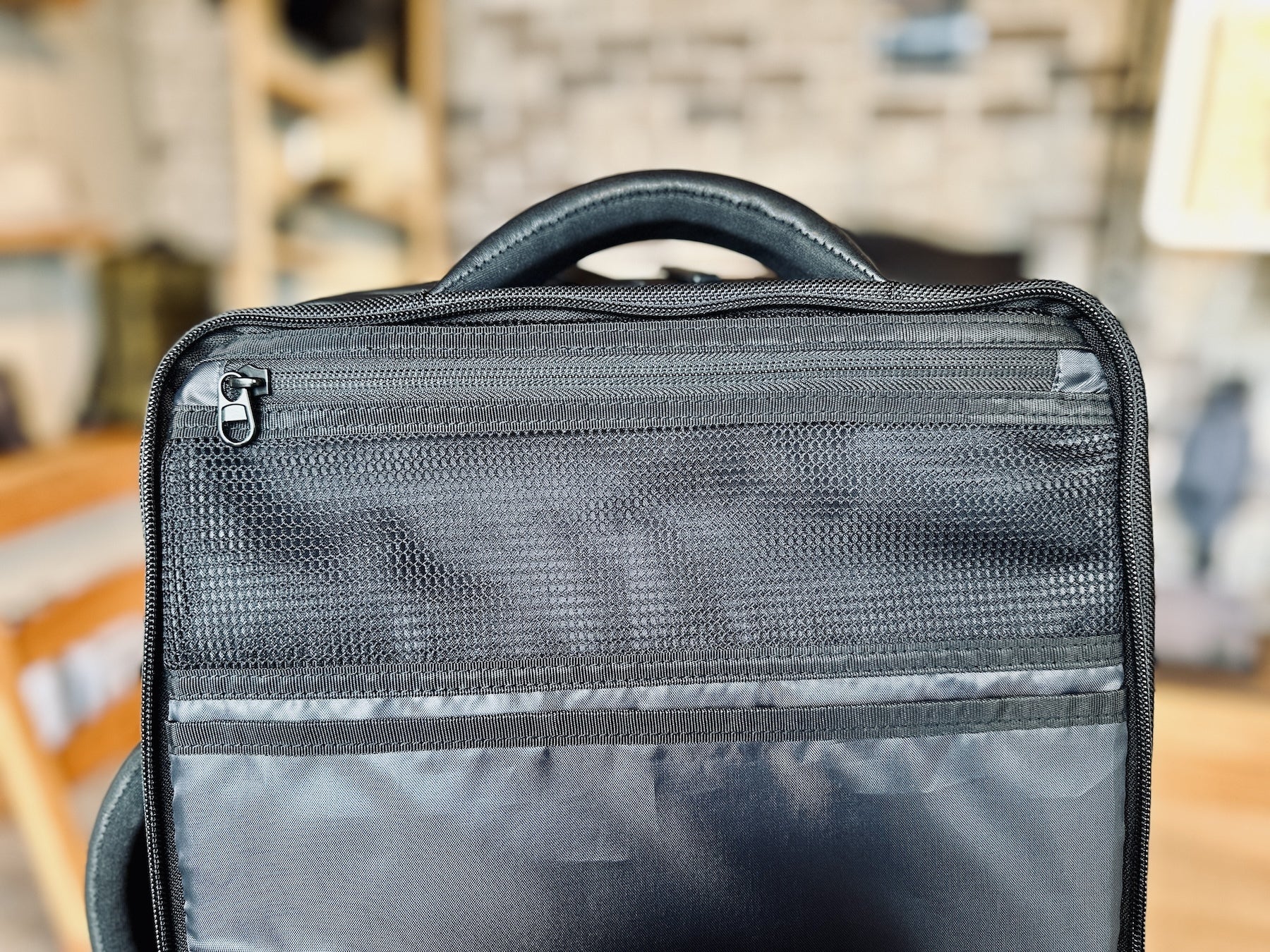 メッシュポケットにはケーブル類やモバイルバッテリーを入れられます