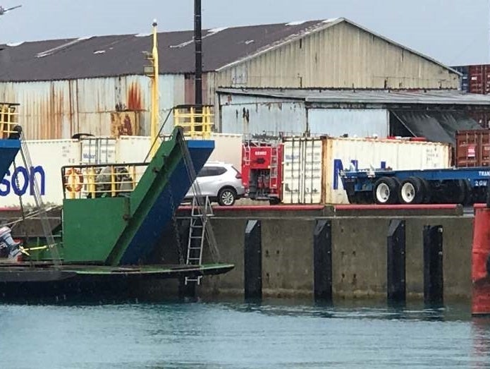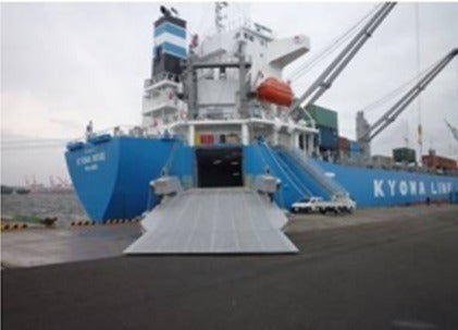 輸送には、南太平洋で活躍している協和海運㈱にご協力頂いています。この船は、南太平洋の島嶼国等向けに運航されているハイブリッド船です。ハイブリッド船は、貨物(コンテナ)と車輛をクレーンで積み下ろしする必要のない、大型の5トン水槽付き消防ポンプ自動車を自走で乗船、下船できる船です。このハイブリッド船にて協和海運(株)の元、ミクロネシア連邦チューク州チューク港へ輸送します。ハイブリッド船の利点は、輸送費用を抑えると共に車輛に負担をかけずに運ぶことができます。
