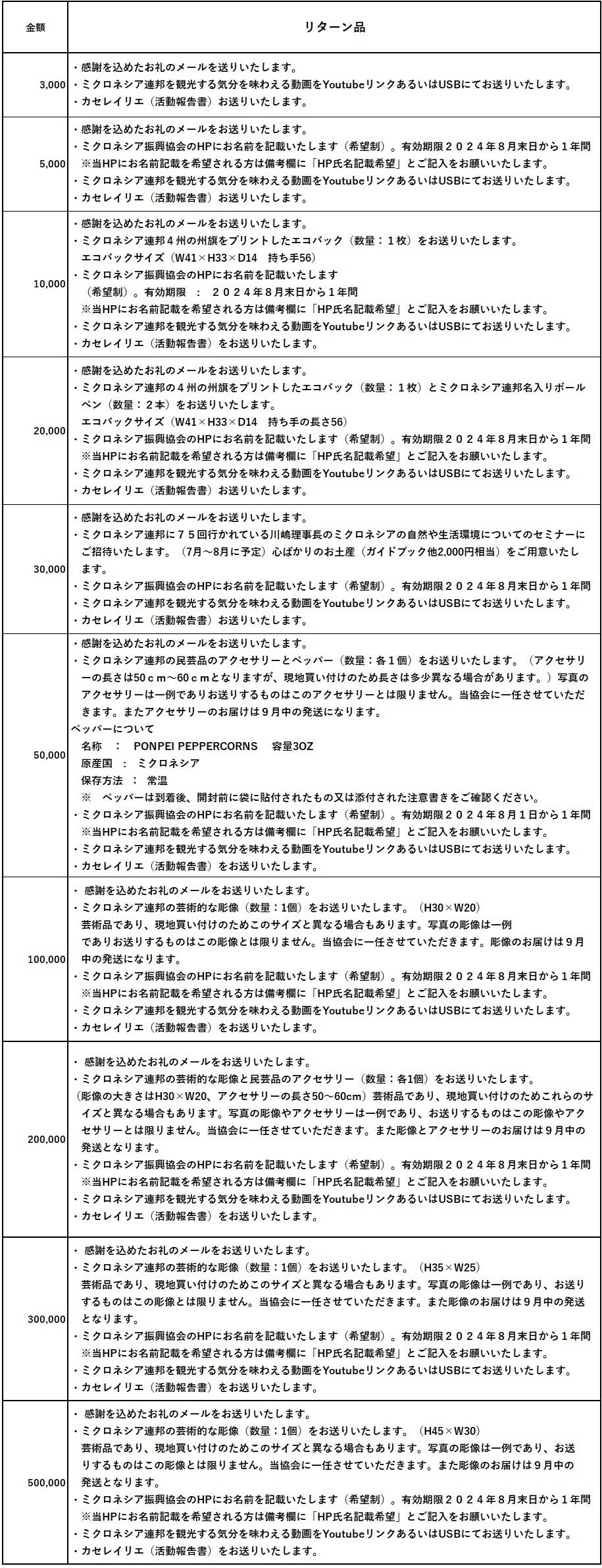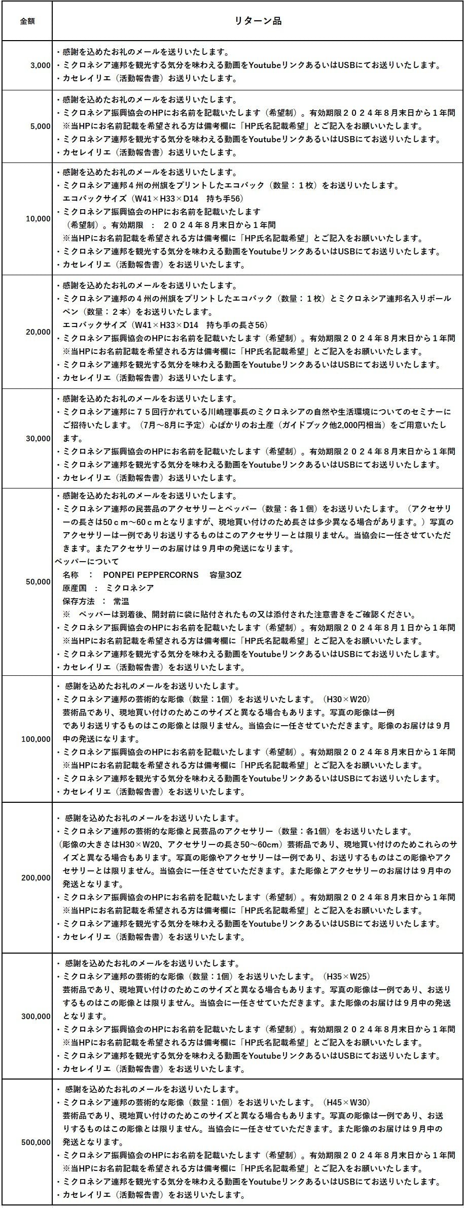 その他のリターン品については次の通りとなります。