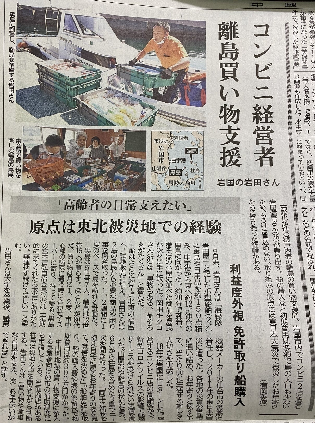 山間部は市内のスーパーなどが移動販売車で回ってますが、離島にはそのような販売支援は無く、島民の方はフェリーで往復4,000円近く掛けて、市内の小売店で買い上げた商品を手にいっぱい持って移動されておりました。