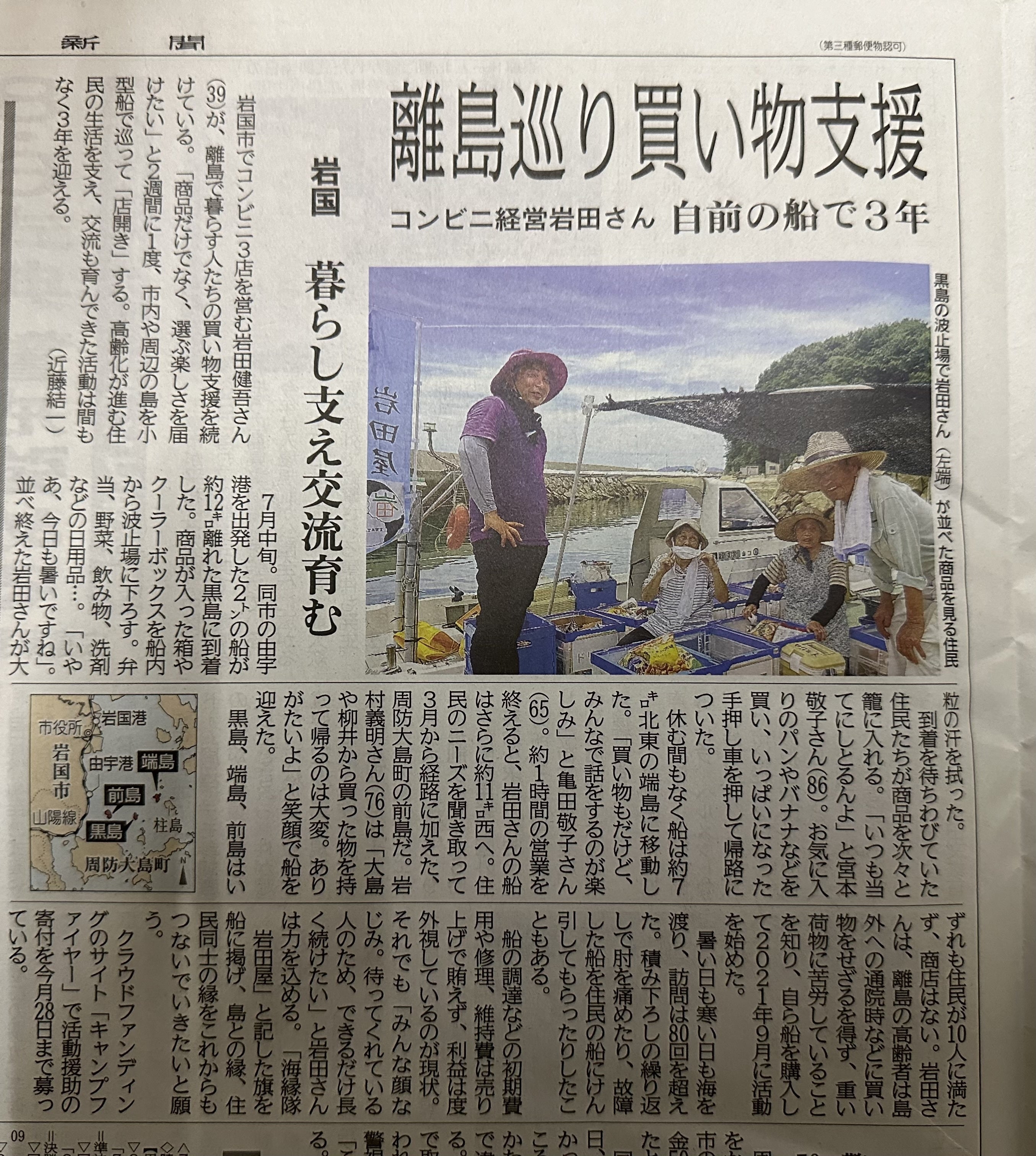 私の住んでいる岩国市では、郊外の山間部、柱島、端島、黒島の有人島3島が中山間地域での買い物弱者重点エリアとして定めています。