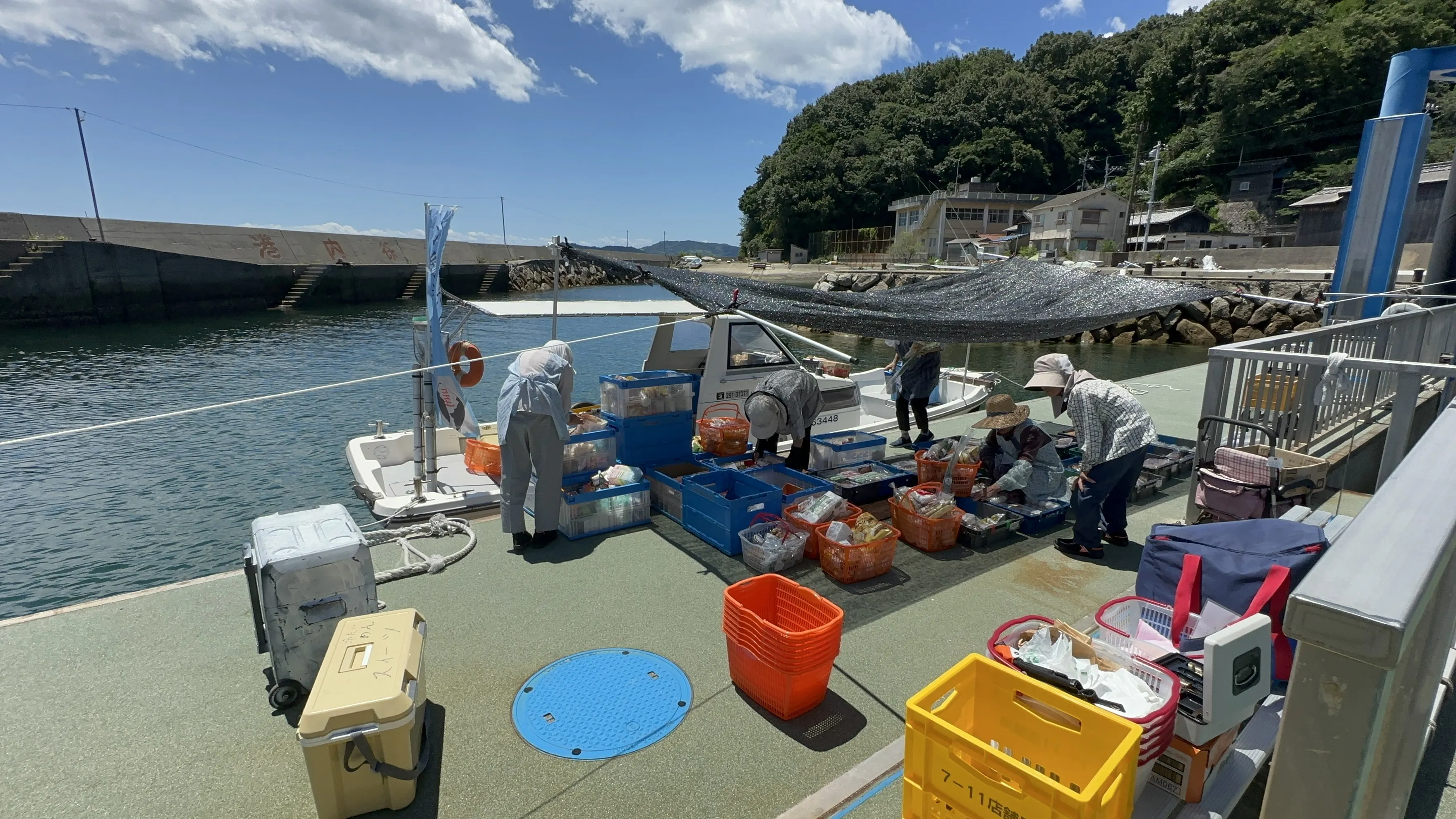 34℃の炎天下の中、屋根を船横で展開しての販売を行いました。