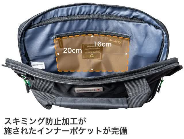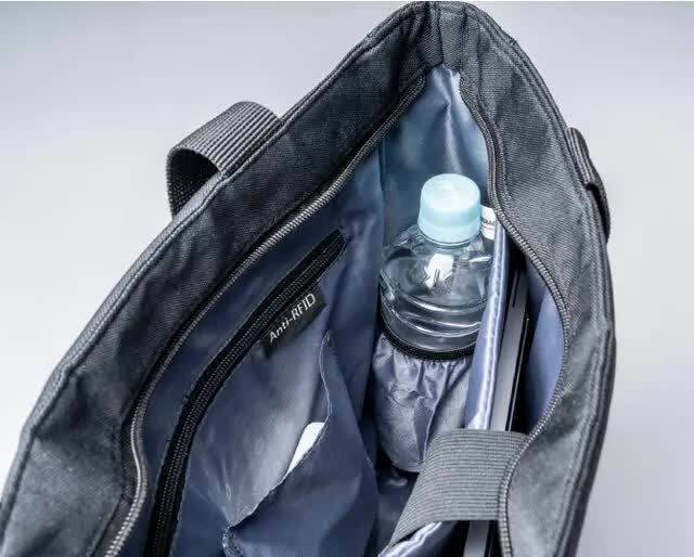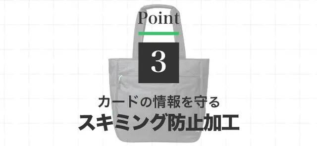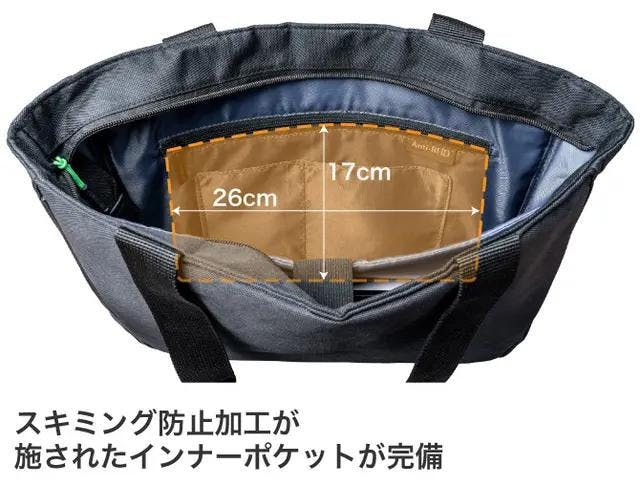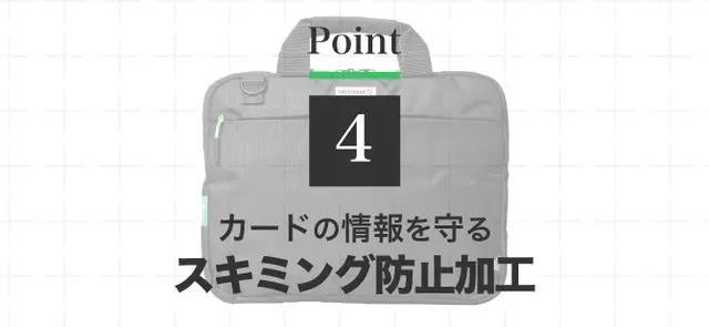 ラップトップバッグよりもさらに大きいファスナー付きのインナーポケットはスキミング防止加工が施されており、大切なカード情報などをしっかりと守ります。