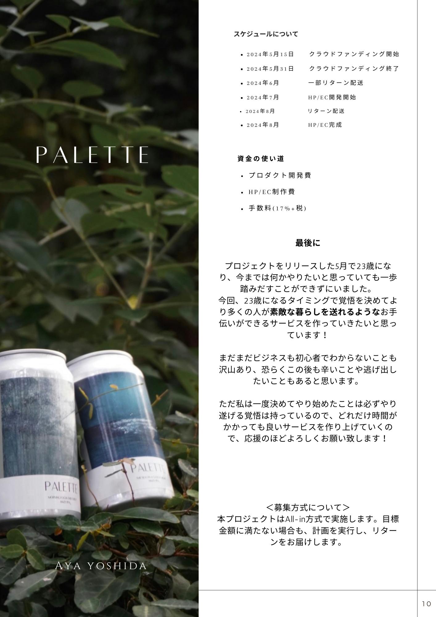 私は今回のプロジェクトを通じて、みなさんが何気ない日常雑貨を購入するときに、「これでいい」ではなく、「これがいい」と思うことができる商品を開発・販売を行い、「好きに囲まれ、好きで溢れる暮らし」のお手伝いをするサービス「PALETTE」の立ち上げを行いたいです。