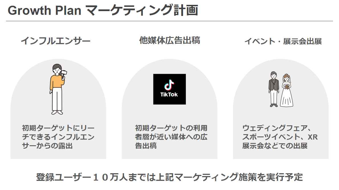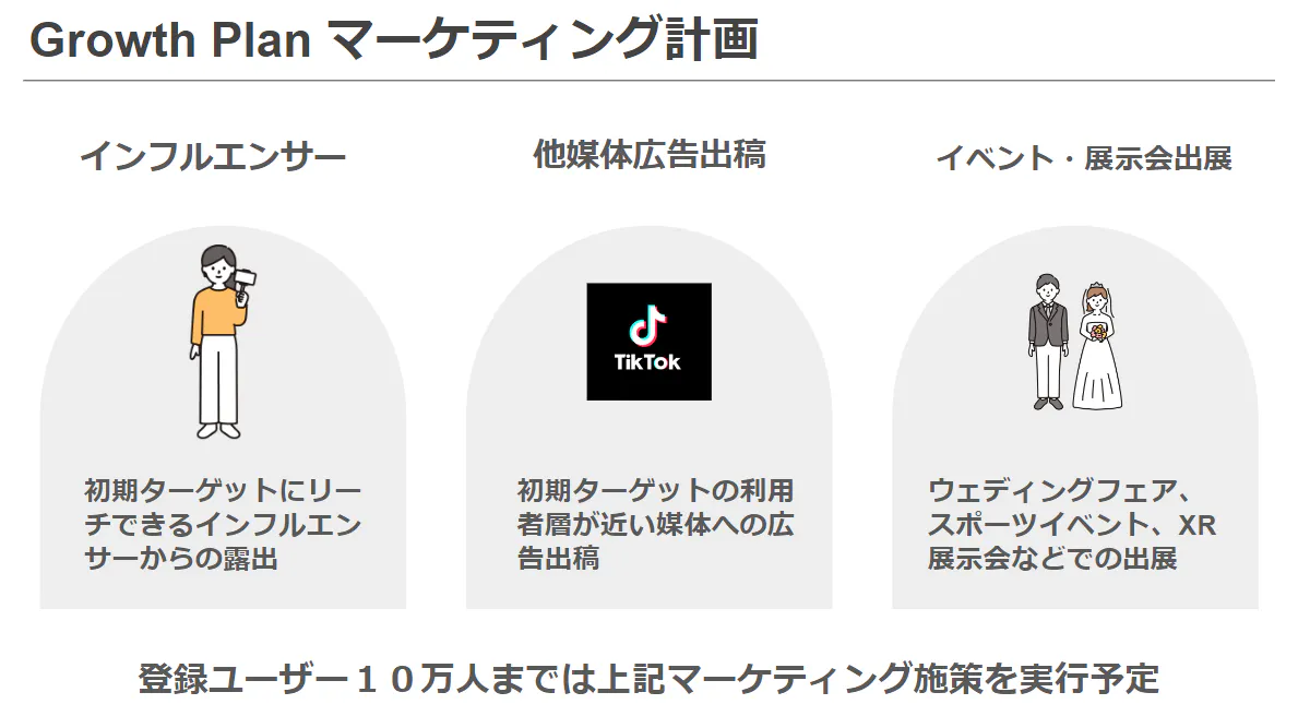 登録ユーザー10万人までのマーケティング計画は以下のように考えています。