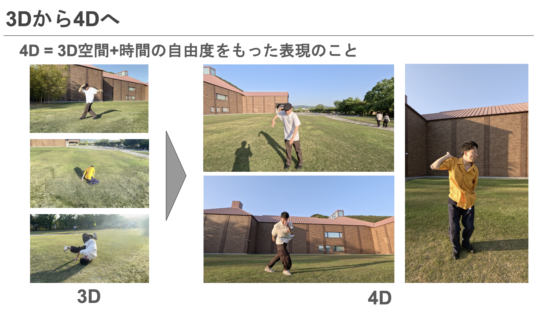 そこで私たちは、4D動画生成技術を用いて、これらの一瞬をよりリアルに記録するプロジェクトを立ち上げました。4D動画とは、映像に時間と空間を超えた新たな次元を加える技術で、視聴者がその場にいるかのような体験を提供します。