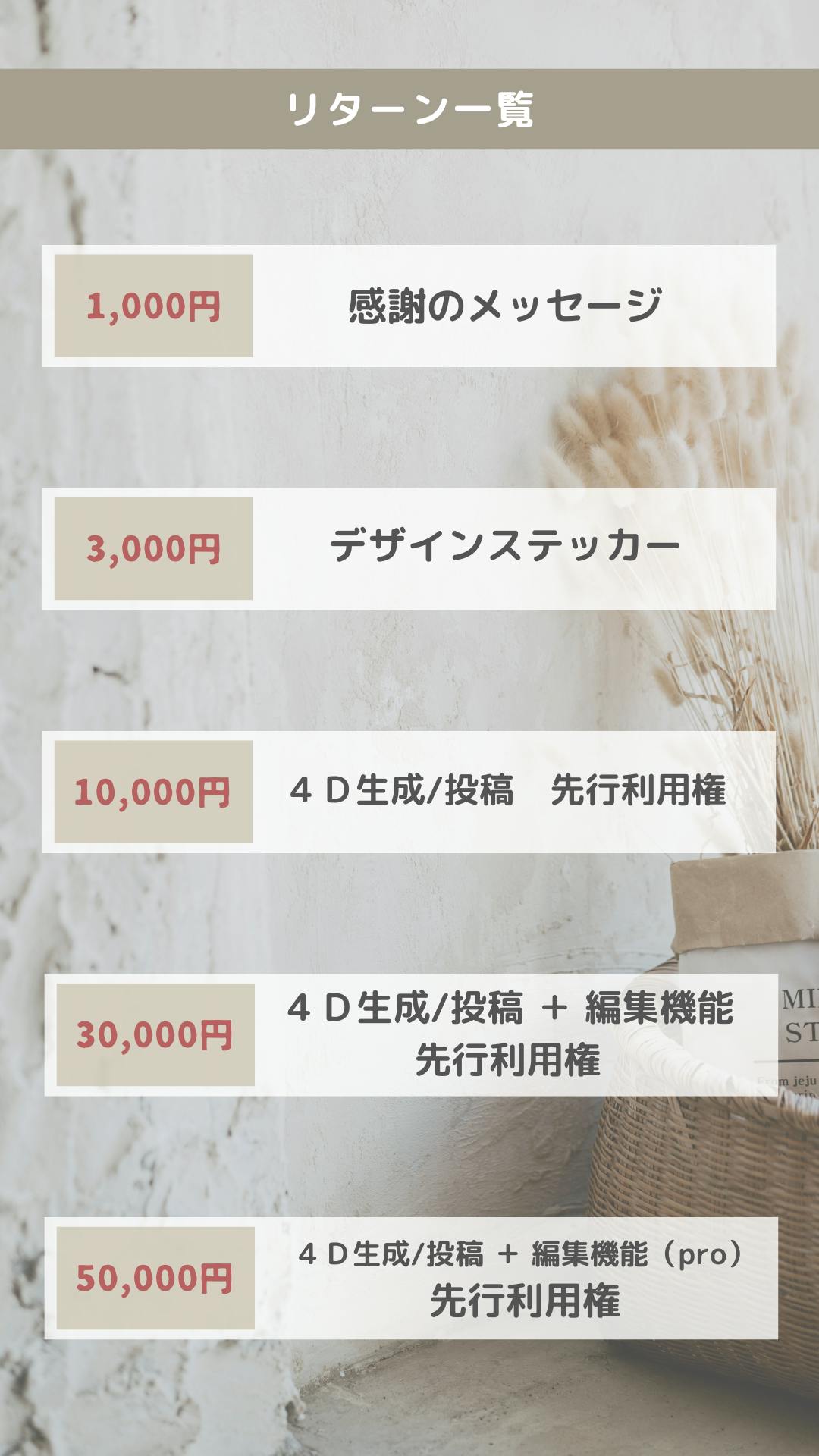 皆さまのご支援によって、ただの想い出を超えた、"体験そのもの"を残すことができます。4D動画で、人生の貴重な瞬間を未来へと伝えましょう。あなたもこの革新的な旅に参加しませんか?