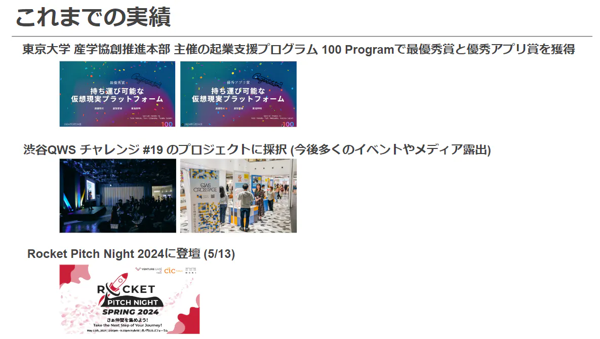 現在: 既に3D動画のプロトタイプを開発し、ビジネスコンテストで受賞実績があります。5月13日にRocket Pitch Night 2024に登壇し、渋谷QWSの19期のプロジェクトに採択されています。