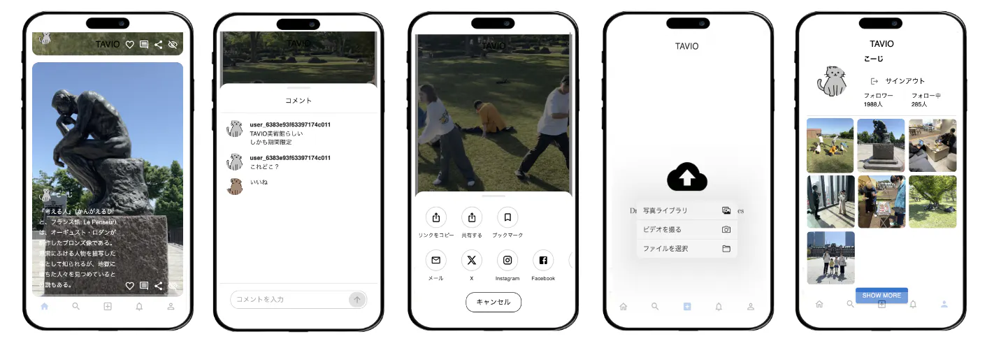 お手持ちのスマホで撮影した4D動画をTAVIOというSNSで共有したり、友人やフォロワーが撮影した4D動画を閲覧・いいねやコメントなどのリアクションができます。