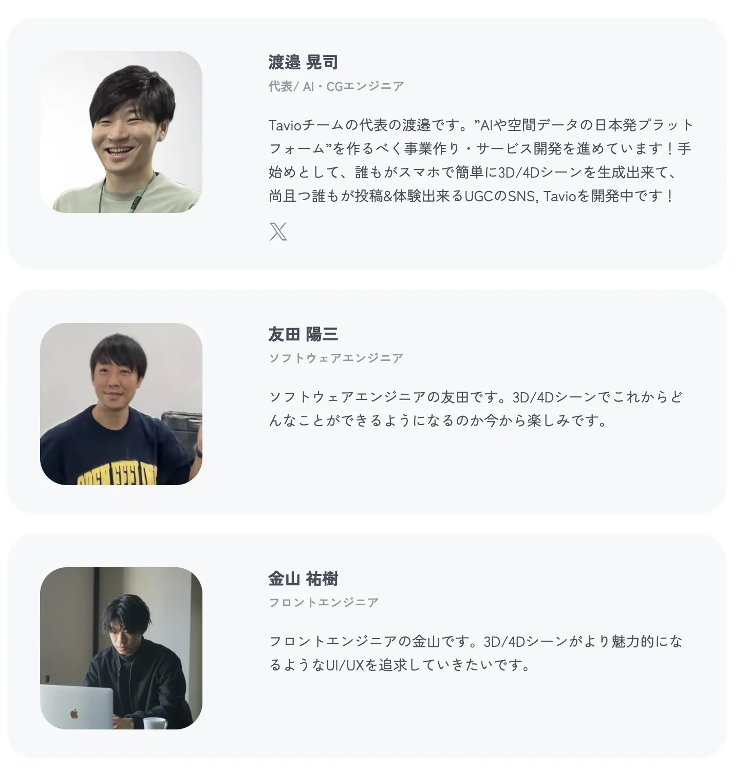 現状は3Dシーン (止まっているシーン)が対象となっているTAVIOですが、将来的には4D (3D空間+時間)の自由度を持ったシーンを生成して投稿できるSNS型プラットフォームを作りたいと思っています。