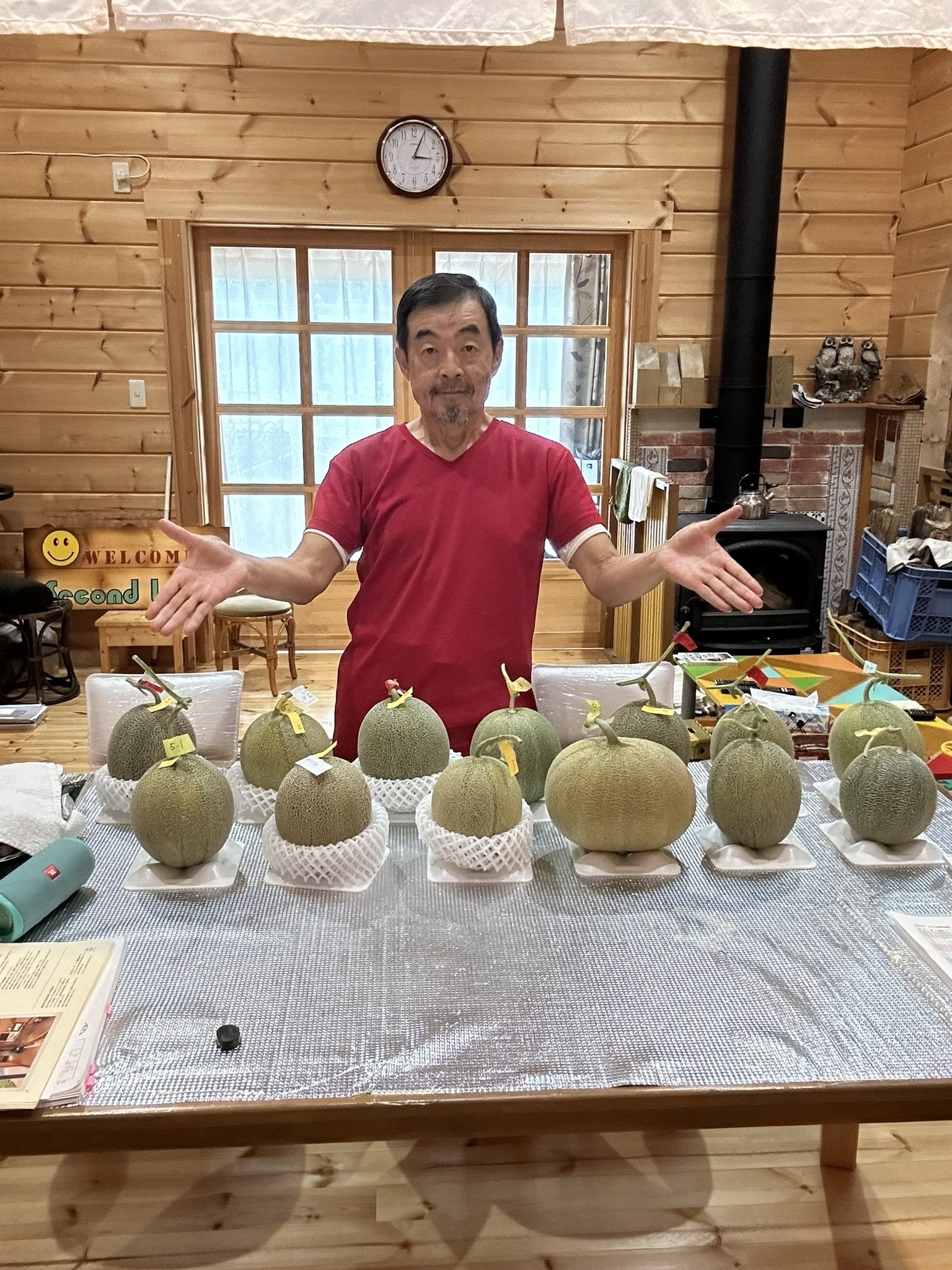「収穫したメロン(優香)です」 「スナック バレルサウナ ⁈」
