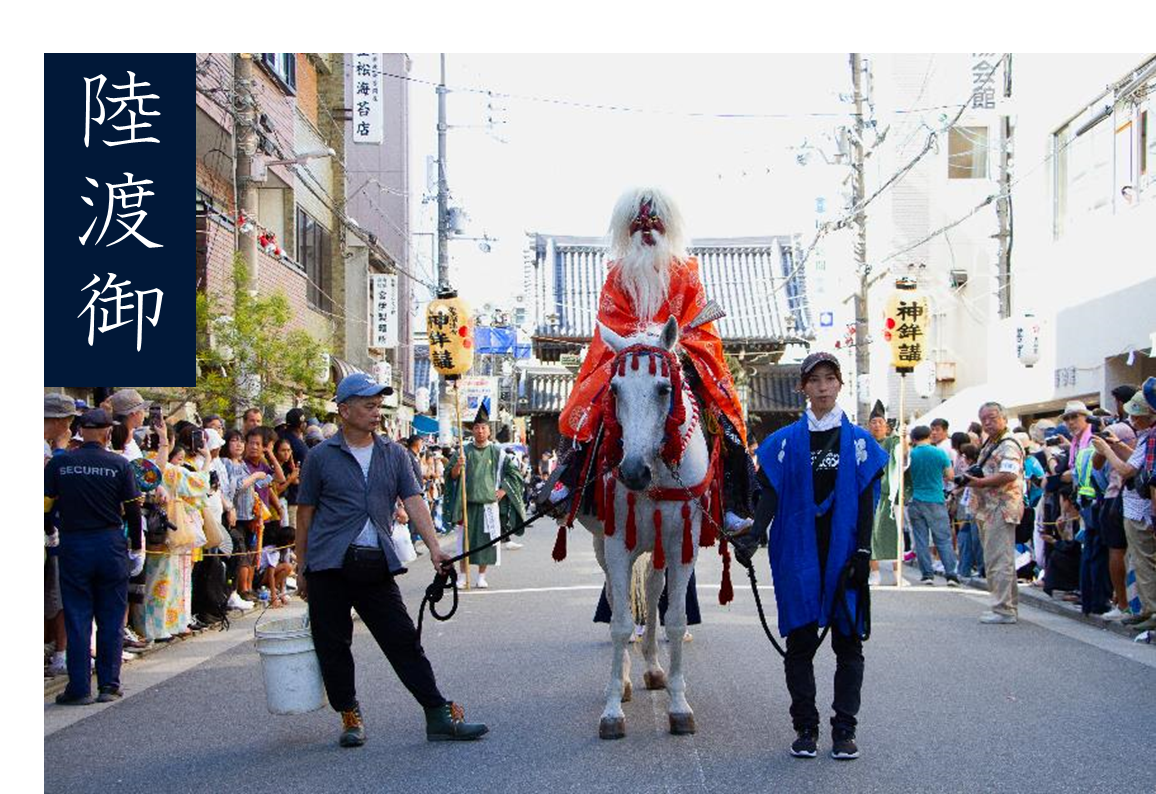 御旅所の準備ができると神様は、陸路で川岸までお出になられ、船に乗り大川を下り御旅所へ向かうルートを辿ったと言われています。この神様のお出ましを祝って、行列を組んでお供をしたり、お迎えしたりしたのが陸渡御・船渡御(りくとぎょ・ふなとぎょ)の始まりです。