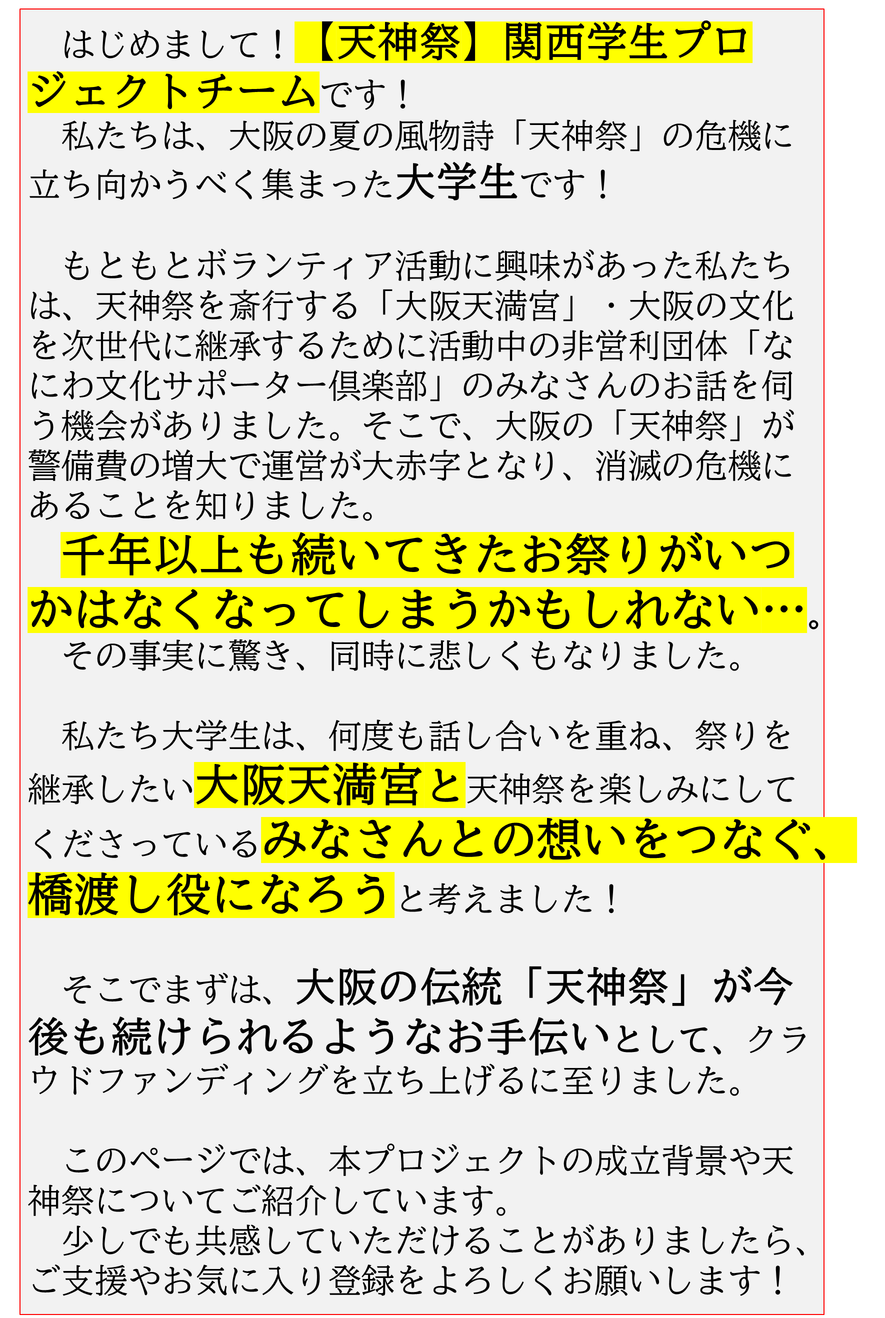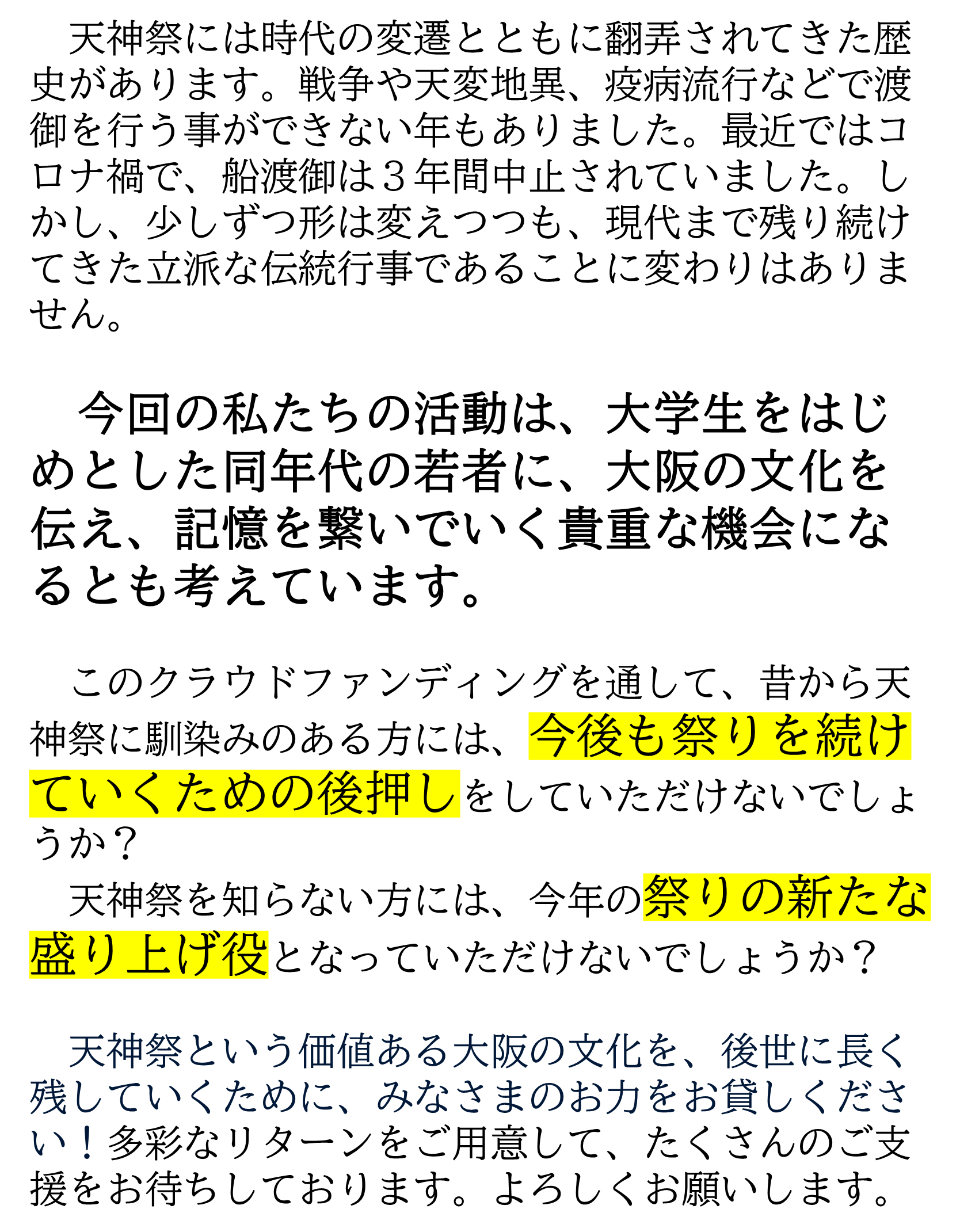 そう考えた私たちは、クラウドファンディングによる天神祭資金集めのため、動き出しました。