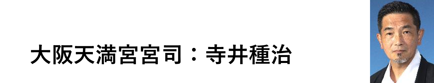大阪天満宮宮司の寺井種治と申します。私は平成30年4月1日に第58代目の宮司を拝命しました。私ども寺井家は代々大阪天満宮の社家であり、ご先祖が代々守って来たこの大阪天満宮の歴史文化・祭を継承し後世に伝えていく使命を担っています。