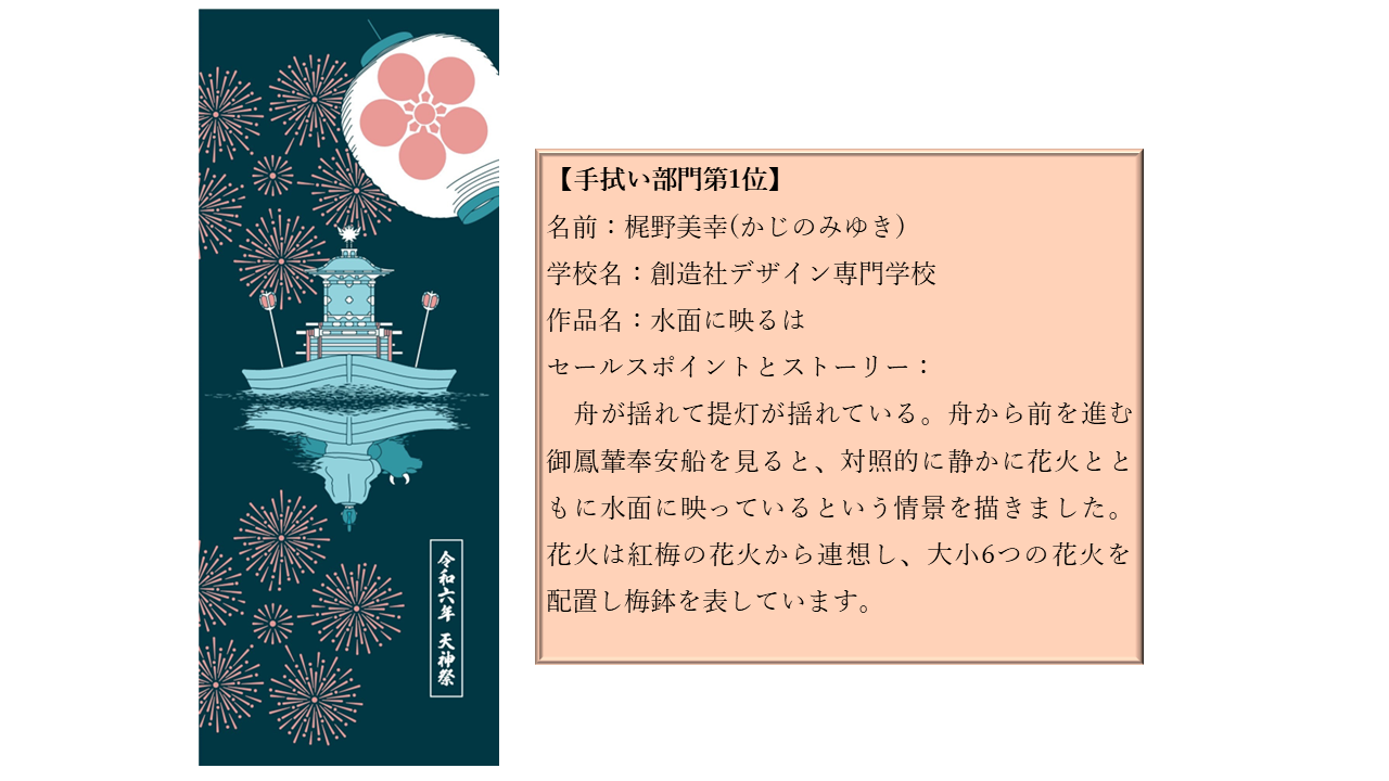 手拭い・扇子は「梅鉢と花火」、公式キャラクターは「御迎え人形」がテーマです。どちらも天神祭にぴったりなテーマを設定いたしました。優勝すると自分の作品がリターンとして、多くの方に見ていただけるということもあり、関西各地のたくさんの学生から応募がありました。そして大阪天満宮・天神祭渡御行事保存協賛会・なにわ文化サポーター倶楽部・学生プロジェクトのメンバーが、選考を行い、優勝作品が決定いたしました!