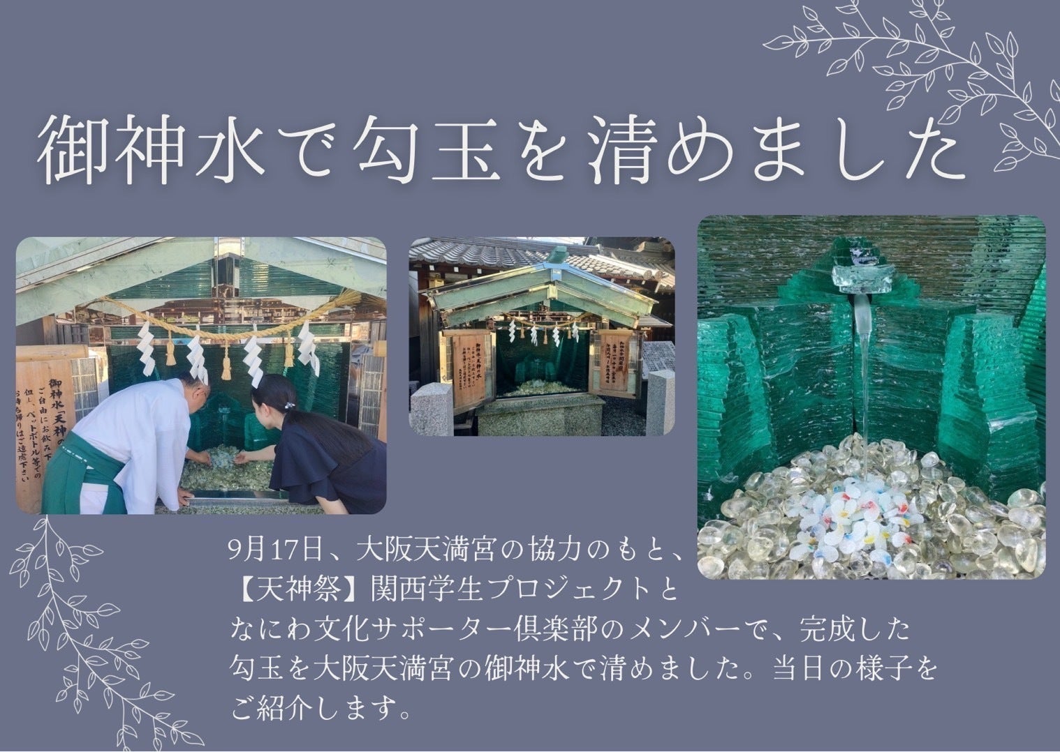 2024/09/29 16:05今月【天神祭】関西学生プロジェクトチームが行った活動についてご紹介します。9月17日に大阪天満宮の御神水で、リターンの勾玉キーホルダーを清めました。勾玉キーホルダーの発送は完了いたしましたので、当プランでご支援くださった方々は今しばらく到着をお待ちください!※ガラス製品のリターンの発送は今冬を予定しておりましたが、9~10月中に発送することが可能となりました。また、9月27日には、大阪天満宮の社務所の一室をお借りして、リターンの梱包作業を行いました。学生となにわ文化サポーター倶楽部のみなさんで協力してスムーズに、丁寧に作業を進められました。リターンの発送準備もただいま進めておりますので、ご支援くださった方々は到着まで楽しみにお待ちください。今後とも【天神祭】関西学生プロジェクトチームの活動にご注目くだされば幸いです。何卒よろしくお願い申し上げます。 もっと見る