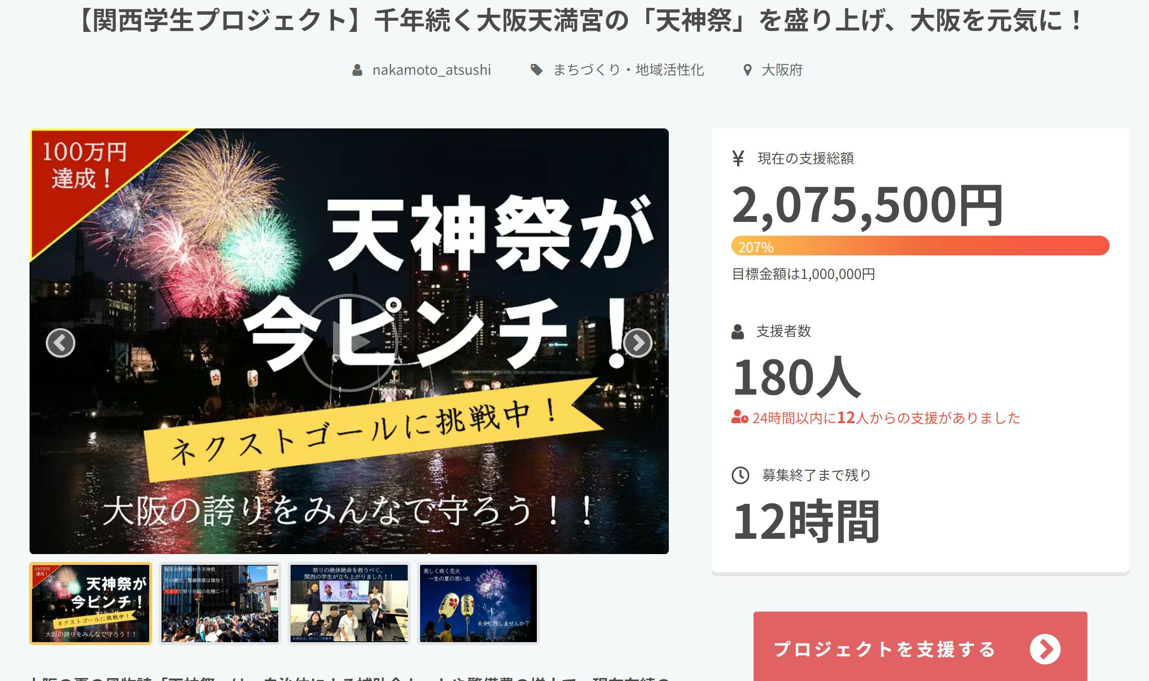 2024/08/02 11:45おかげさまで、ネクストゴール金額の200万円を達成することができました!こんな大台をまさか達成できるとは思っていませんでした…!みなさんのご支援に支えられて成り立っております。たくさんのご支援、本当にありがとうございました!!私たちは天神祭を未来に残していくために、これからも活動を続ける予定です。もしよろしければ、今後とも応援していただければ幸いです!※クラウドファンディングは本日中まで受け付けております。 ご支援がまだという方はぜひご協力のほどよろしくお願いいたします。 もっと見る