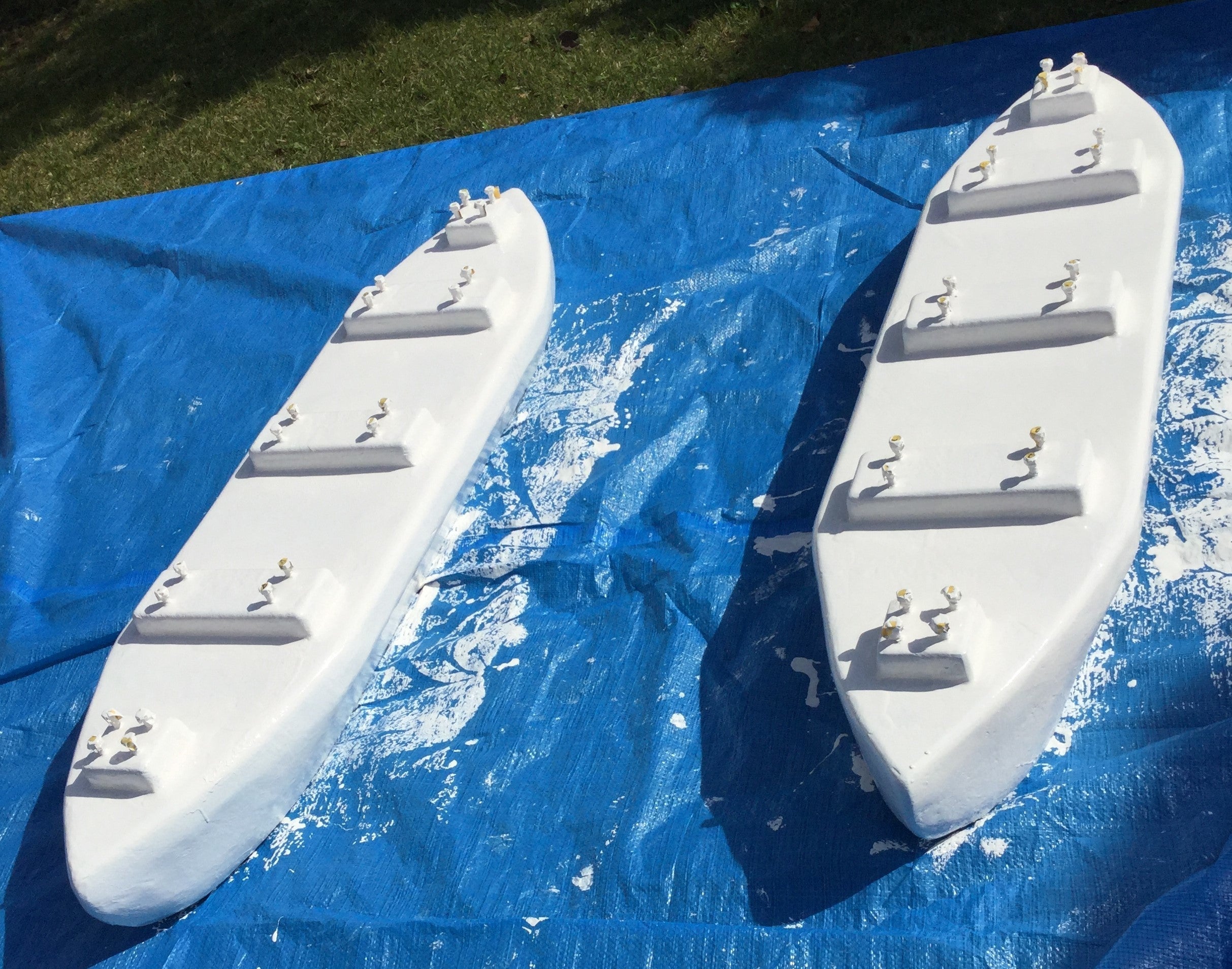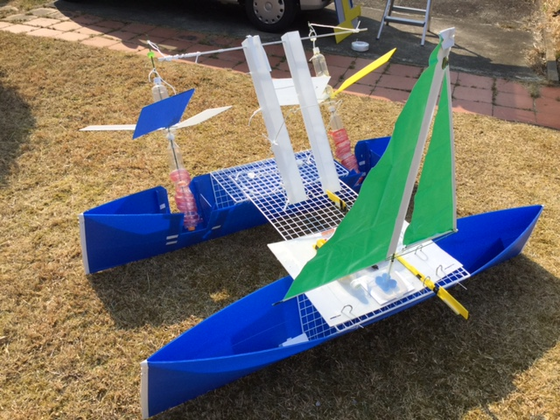 前回の投稿では、組み上げたものの踏ん張りが利かず船体を持ち上げられない、というところまででした(涙)。いろいろ考えたのですが、今あるものを削ったりして軽くする、というのは現実的に難しいです。水際で組んで引きずり下ろすことも検討しましたが、あまり船底を摺りたくない。で、地面レベルから持ち上げるから腰を大きく屈めてしまい力が入らないのか?少し高い位置で組み上げて、そこからセイルを立てて持ち上げればできるのか?を試すこととなりました。おなじみイレクターのパイプを"コ"の字型にし、真ん中に可動の突っ張り棒を追加。各脚にロープを渡して広がり幅を固定するという、最も手抜きな形状。4つ作って並べるとこんな感じ。ということで、組み上げて持ち上げてみました。重たいですが、何とか運べそうです。ゆくゆくは誰かに手伝ってほしい。