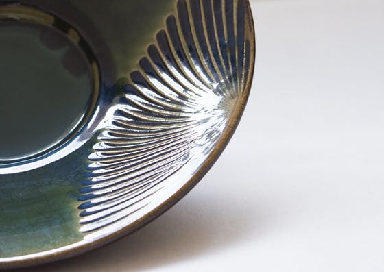 深くも澄んだ緑と青色に、沖縄では神聖な木とされるクバの木の葉がモチーフに使われた、ユニークで美しい壺屋焼です。1点1点、クバの木の模様は手で彫られていています。