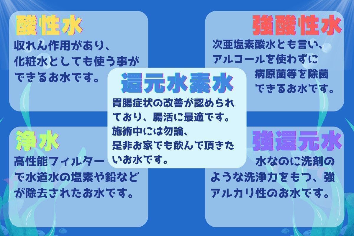 ●厚生労働省管理医療機器認証番号を取得した浄水器を使い、「還元水素水」「強酸性水」「酸性水」「浄水」「強還元水」5つの水を使い分ける事で身体を内側からも外側からも綺麗に!