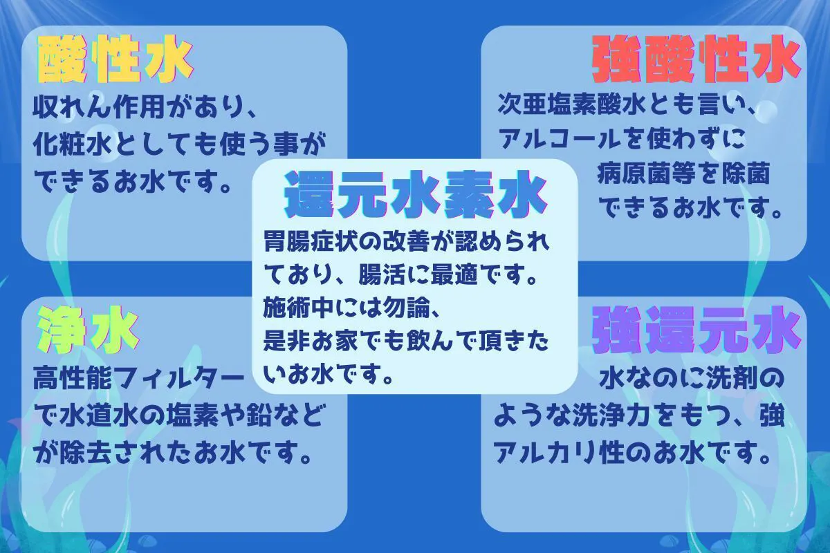 ●厚生労働省管理医療機器認証番号を取得した浄水器を使い、「還元水素水」「強酸性水」「酸性水」「浄水」「強還元水」5つの水を使い分ける事で身体を内側からも外側からも綺麗に!