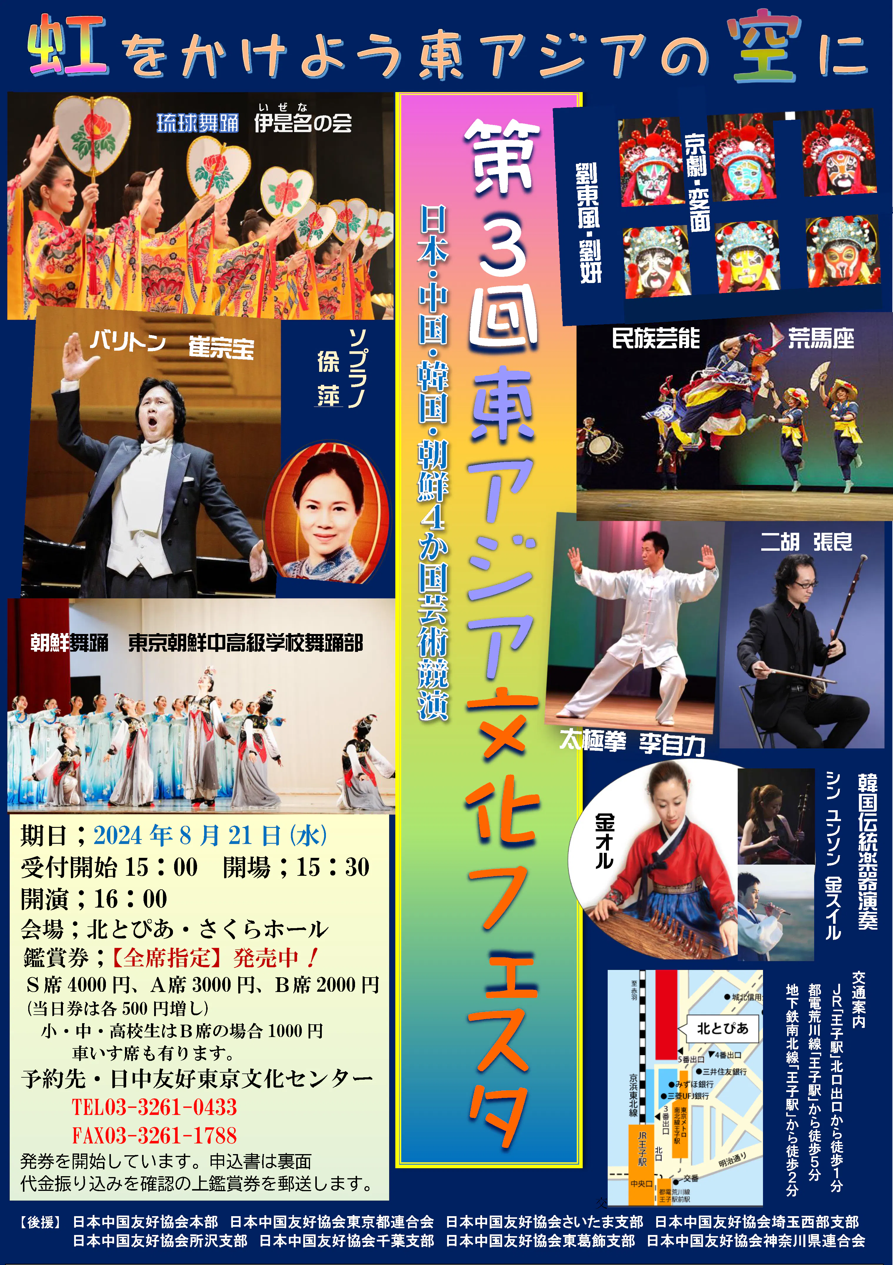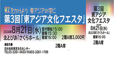 本来、各国の国民同士はアジアの仲間、友人であって、平和を求める気持ちは同じです。そのような中で、今年8月21日(水)、日本、中国、韓国、朝鮮、4カ国の文化・芸術を通じた友好交流の祭典が実現します。これは、相互の理解と和解を進める上で、画期的なイベントとなります。