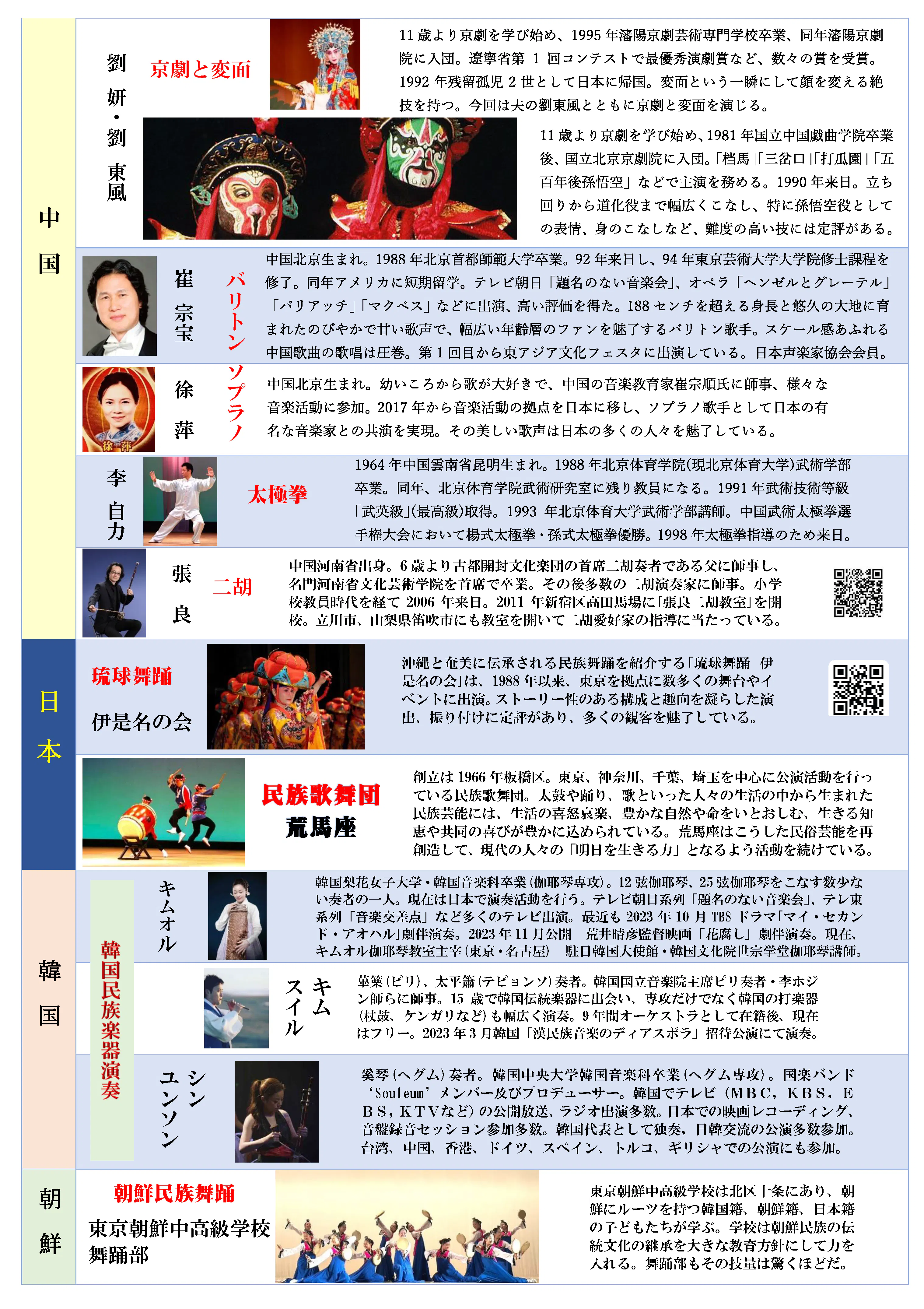2024/07/13 16:17第3回東アジア文化フェスタは、8月21日(水)の開催まで1か月あまりとなり、着々と準備が進んでおります。開催に先立ち、7月11日に記者発表を行い、劉妍(りゅう・けん)さんと、夫の劉東風(りゅう・とうふう) さんに変面を実際に演じて頂きました。8月21日(水) のイベントでは、実際に観る機会があまりない、変面を東アジア文化フェスタ では実際にご覧いただけます。在日京劇俳優・劉東風さんと劉妍さんのホームページはこちら。http://soliusya.com/index.htmlクラウドファンディングのご支援はこちらから。観覧券のリターンがあります。https://camp-fire.jp/projects/view/754256他にも様々な演者が、一堂に会するこのイベント、是非、ご支援よろしくお願いいたします!概要は以下の通りです。フェスタは3回目ですが、コロナ禍で開催を控えてきたため2019年以来5年ぶりです。中国の国家機密とも言われる伝統技能の「変面」(へんめん)をはじめ、日本では普段見る機会の少ない技を含む本場の多彩な舞踊や演奏が、一同に集まる貴重な場になります。国際情勢が不透明な中、文化交流を通じた相互理解の糸口とすることで、反目しあっている国々がお互いの文化を知り、多様性を受入れ、共存するための基盤が築かれます。我々は文化交流がアジアの平和に寄与することを切に願っています。■在留孤児2世がオリジナルの「双人変面」を披露 フェスタの目玉は、中国の国家機密とも言われ、そのからくりが門外不出とされる「変面」です。踊り手が顔に手をかざしたりマントを翻したりした瞬間、目にも止まらぬ速さで喜怒哀楽を表現するマスクが変わる技です。日本で本格的な変面を鑑賞できる機会は、多くはありません。 フェスタで演じるのは、残留孤児2世の劉妍(りゅう・けん)さんと、夫の劉東風(りゅう・とうふう)さんの夫妻。現在はともに日本在住です。劉妍さんは1985年に瀋陽京劇院に入団して技を磨き、コンテストでの受賞歴も豊富。劉東風さんは1981年に国立北京京劇院に入団し、数々の演目で主演を務めた経験があります。2人が演じるのは、変面に京劇の動作を加えたオリジナルの「双人変面」。1回の演技で顔を変えるのは通常は20回程度ですが、2人は40回ほども顔を変えることができ見ごたえ十分です。■多彩な演者が観客を魅了 東京朝鮮中高級学校舞踊部の朝鮮民族舞踊は本格的です。学校が朝鮮民族の伝統文化継承に力を入れていることもあり、過去には海外でも公演するなど技量は折り紙付きです。韓国の民族楽器のカヤグム(弦楽器)、ヘグム(同)、そして非常に珍しいピリ(笛)の共演も見ものです。 中国からはほかに、バリトン・ソプラノ歌手や二胡、太極拳のプロが出演。日本を代表して、民族歌舞団「荒馬座」が和太鼓に乗って勇壮に踊り、※1「伊是名(いぜな)の会」の琉球舞踊が優雅に観客を魅了します。※1沖縄・奄美の舞踊を創作し国内外に紹介する創作舞踊集団。■「強いつながりを認識してこその平和」 フェスタ実行委員会の事務局を担当する北中一永・日中友好東京文化センター事務局長は「アジアは一つ。各国の文化を知り、互いの強いつながりを認識してこそ、平和があります」と開催の意義を語り、来場を呼びかけています。 もっと見る
