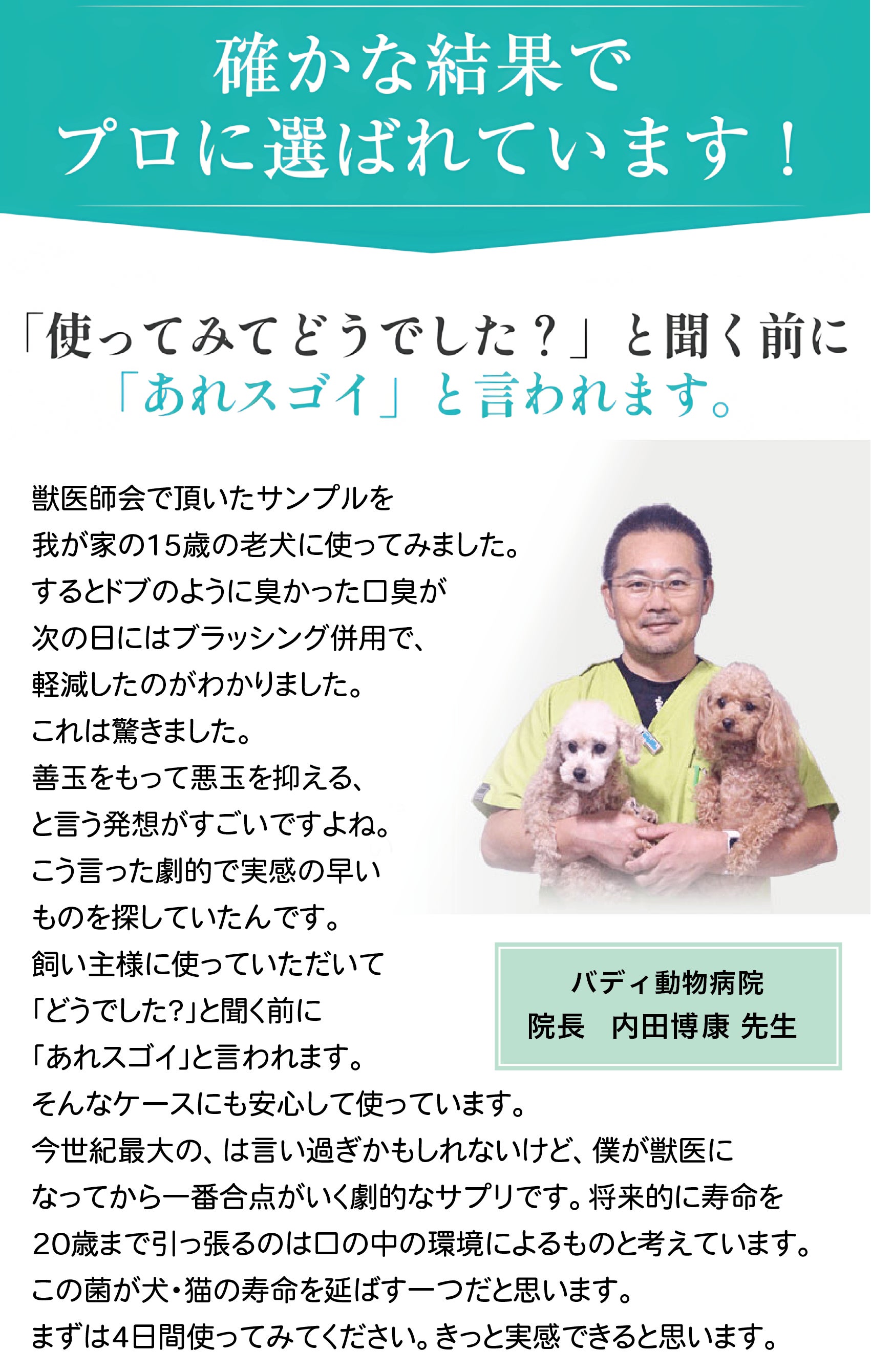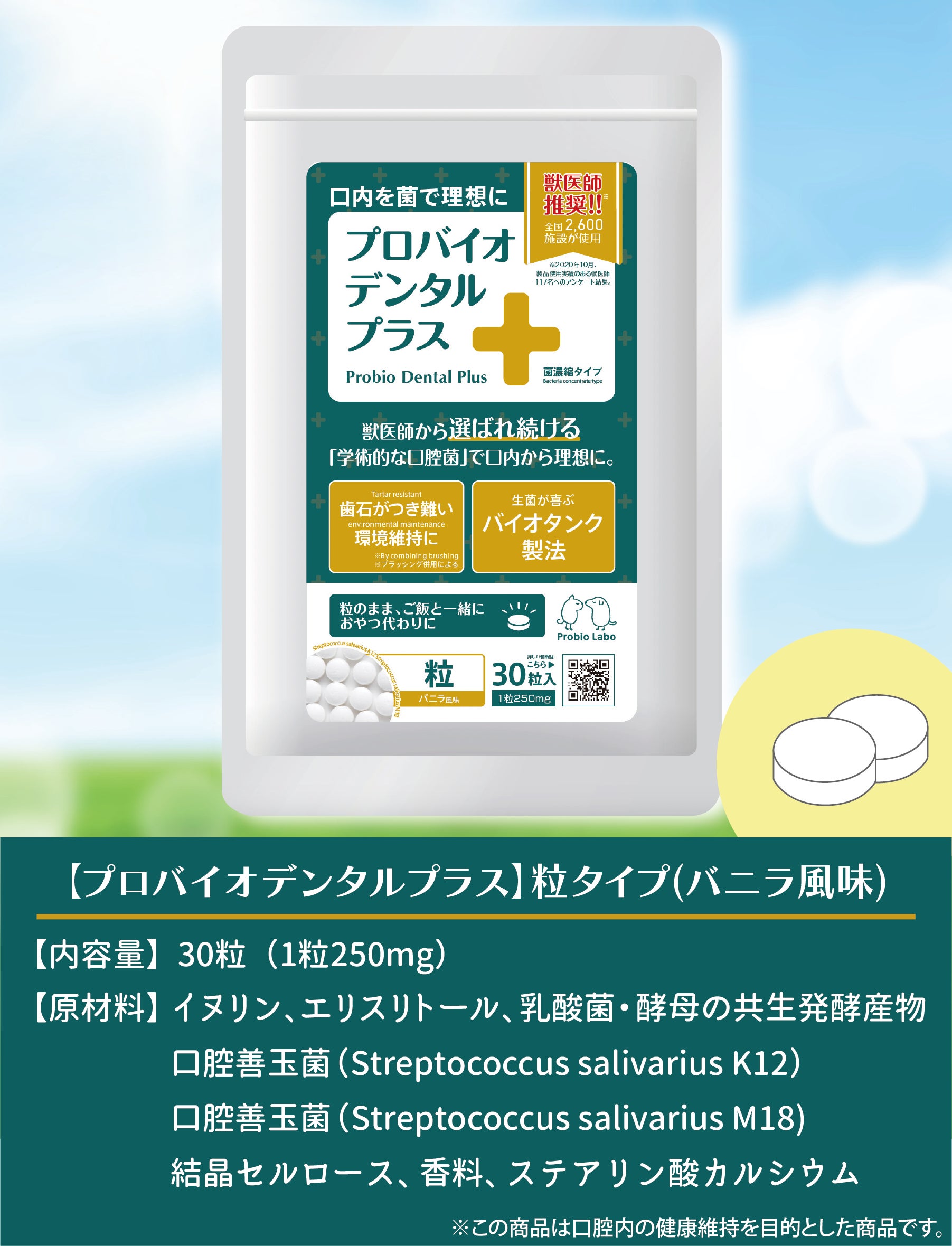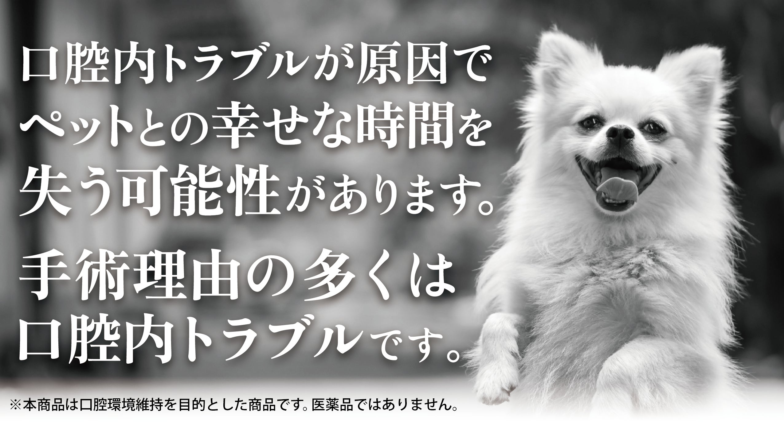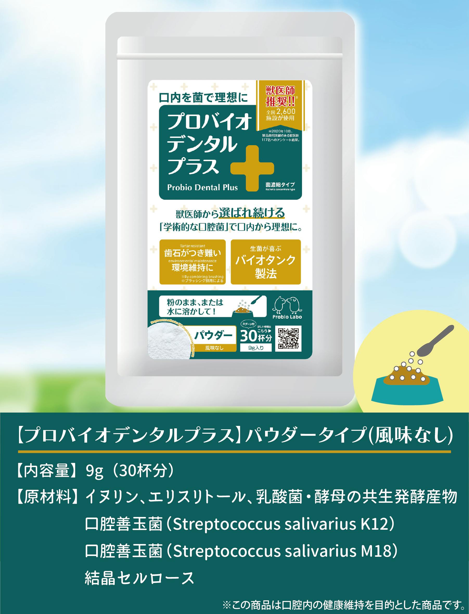 この画期的な方法は、短期間で口臭軽減、口内のネバつきを感じないとの感想を多くいただきます。しかし一般の飼い主様にまだまだ知られておらず、この企画をきっかけに「うちの子」の口内環境に対する意識を高め、家族での幸せな暮らしを送ってほしいと思いペット用「プロバイオデンタルプラス」をご紹介させていただきます。