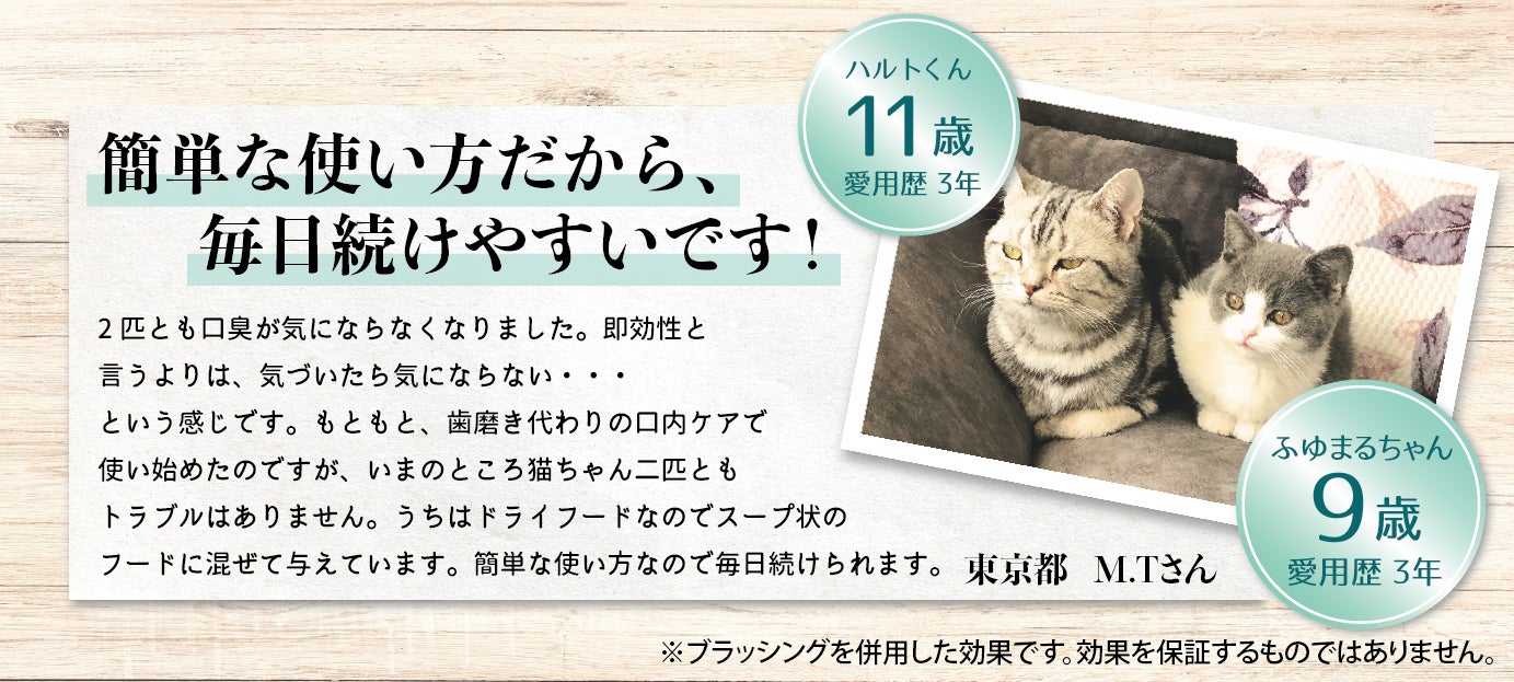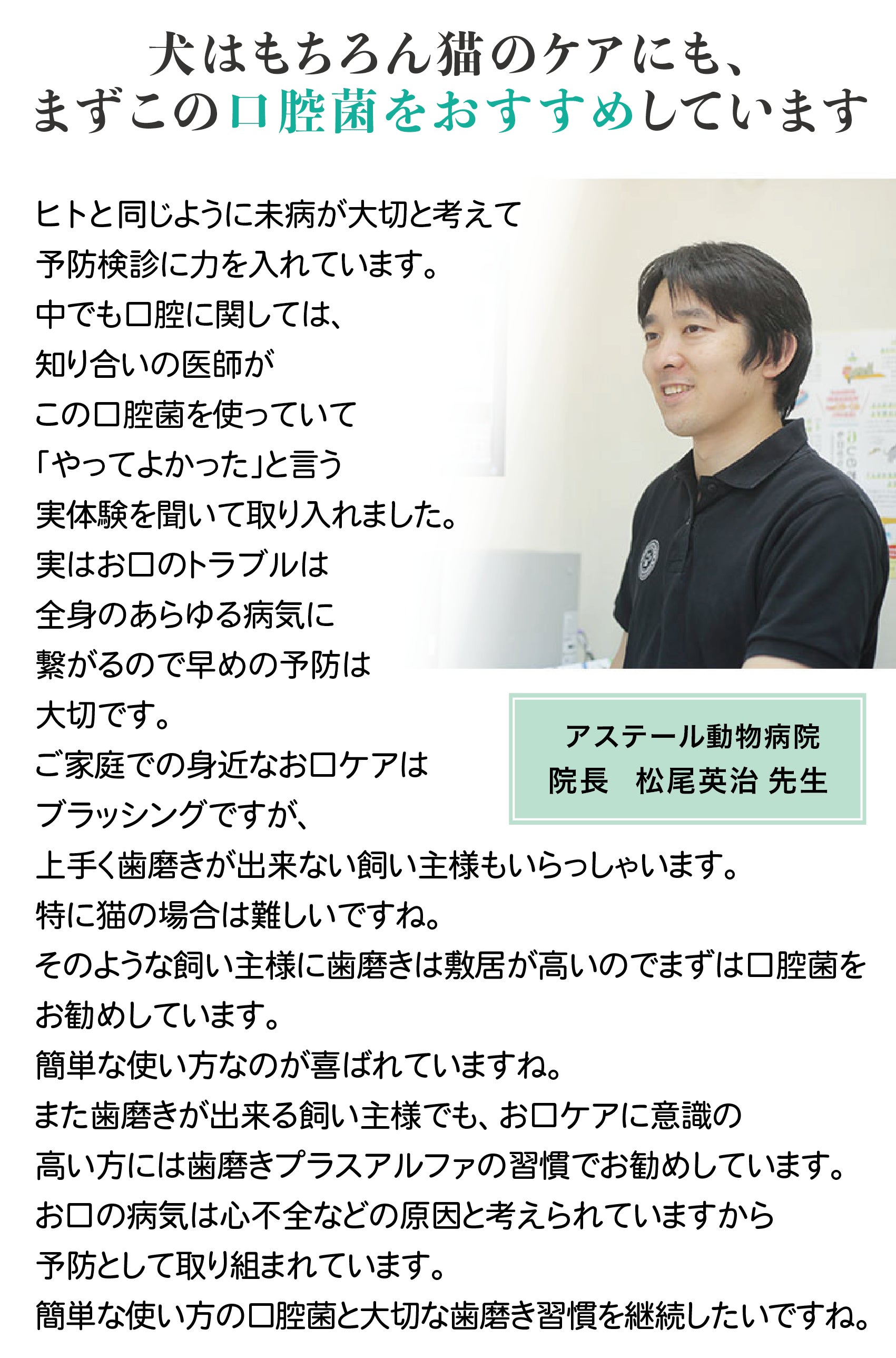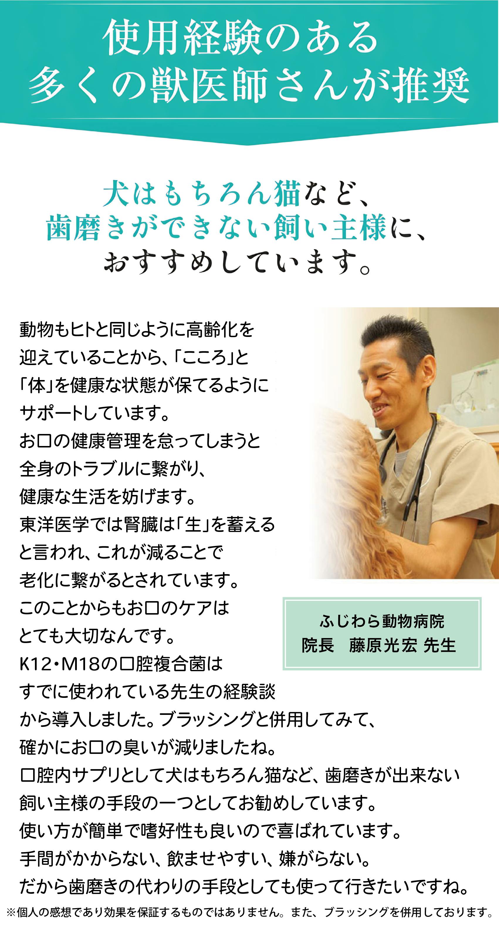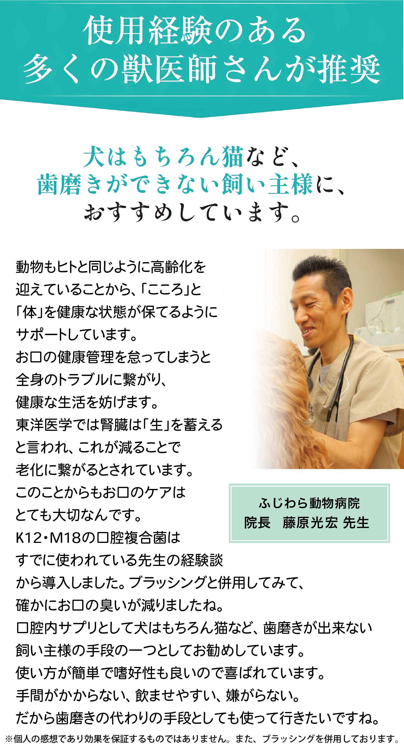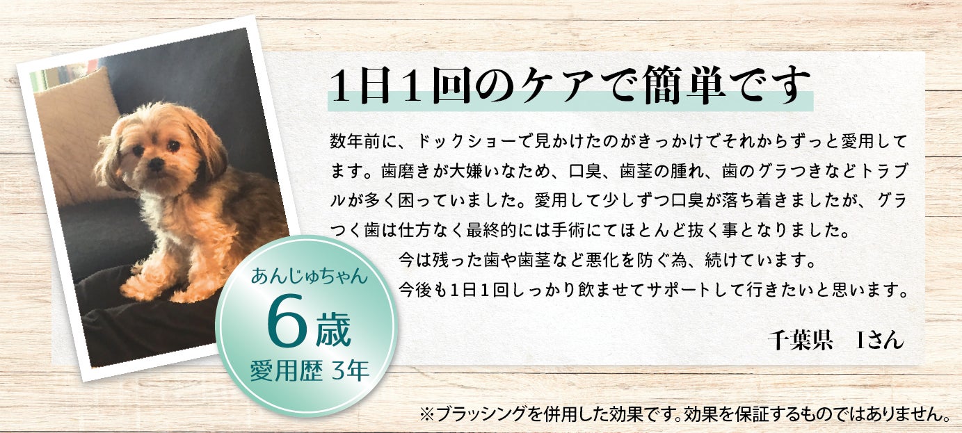この画期的な方法は、短期間で口臭軽減、口内のネバつきを感じないとの感想を多くいただきます。しかし一般の飼い主様にまだまだ知られておらず、この企画をきっかけに「うちの子」の口内環境に対する意識を高め、家族での幸せな暮らしを送ってほしいと思いペット用「プロバイオデンタルプラス」をご紹介させていただきます。