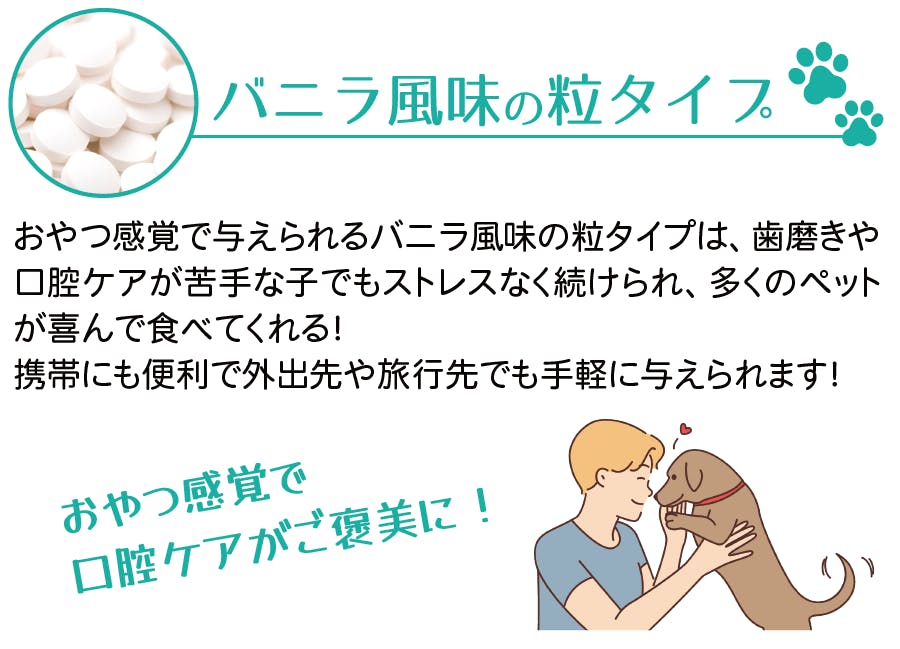 口腔内の善玉菌を増やすことで、口臭や歯垢など、口腔環境の維持をサポートします。使用手軽に与えられるタブレットタイプにより、ペットの健康を守るための飼い主にとって手軽な製品となっています。