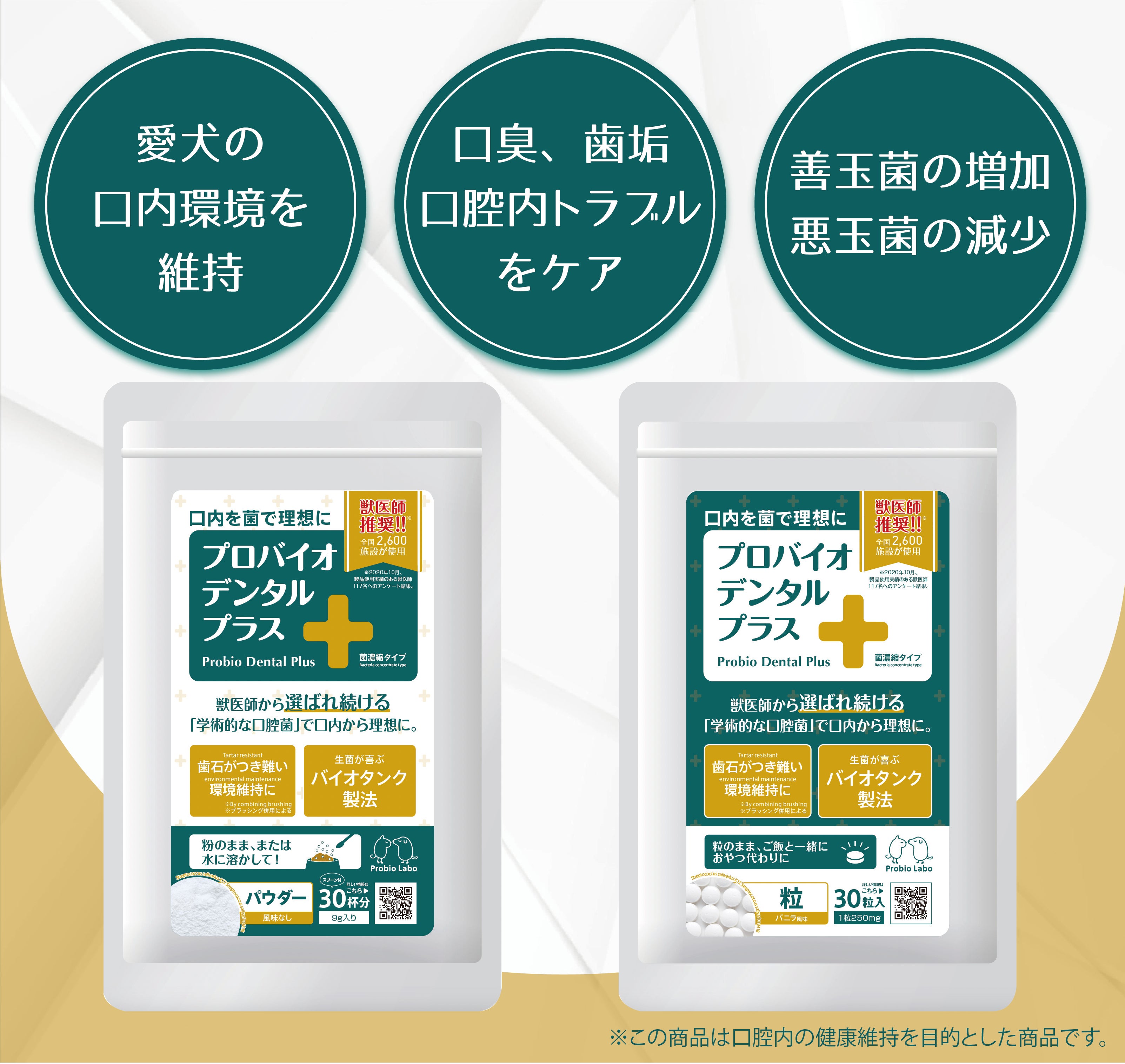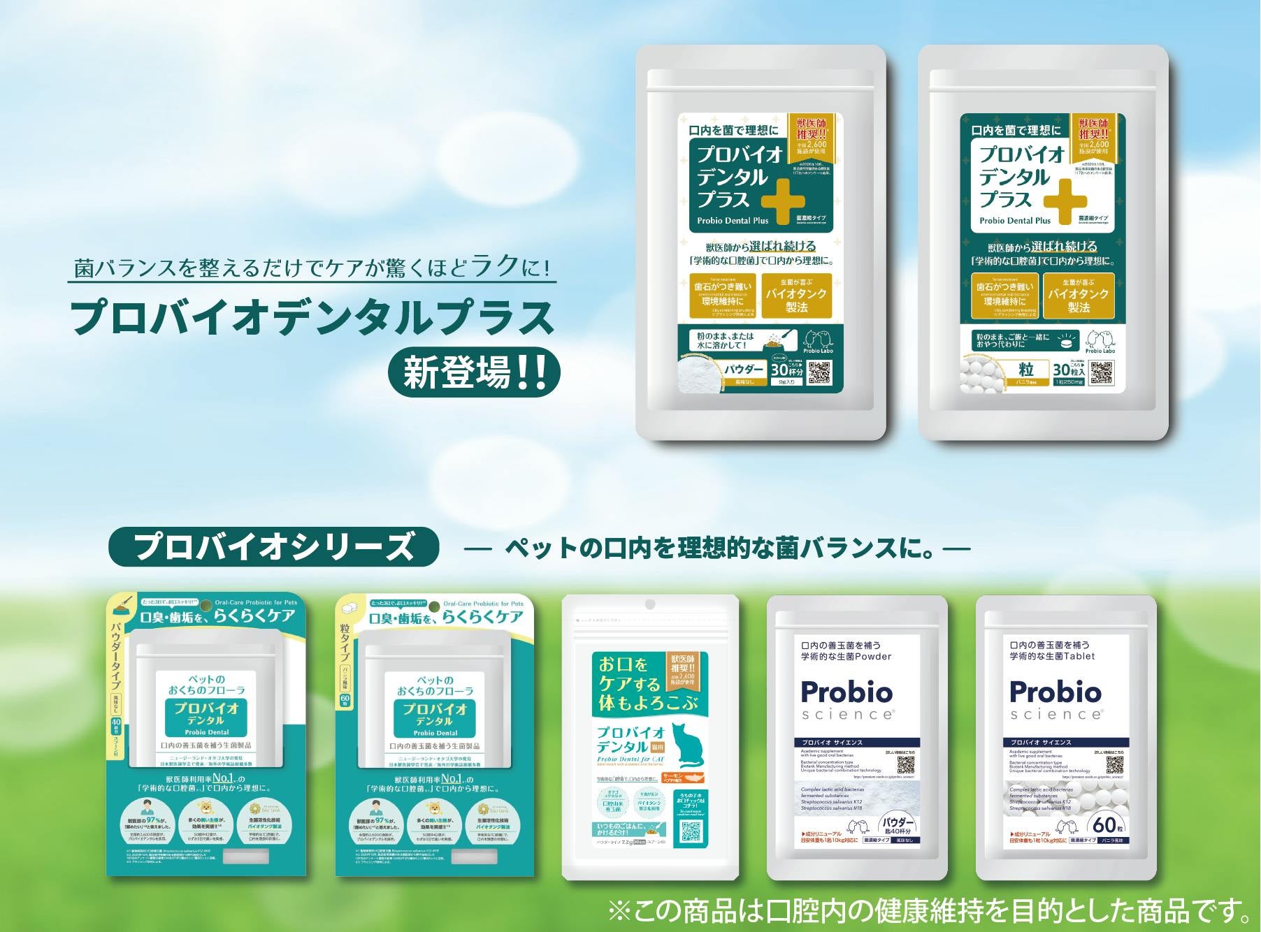 そのため、口内の菌バランスが崩れて口腔内トラブルを引き起こす可能性があります。そこで、口内環境を清潔に保ち、菌を最適なバランスに整えるための商品が、ペット用口腔ケアサプリメント「プロバイオシリーズ」です。