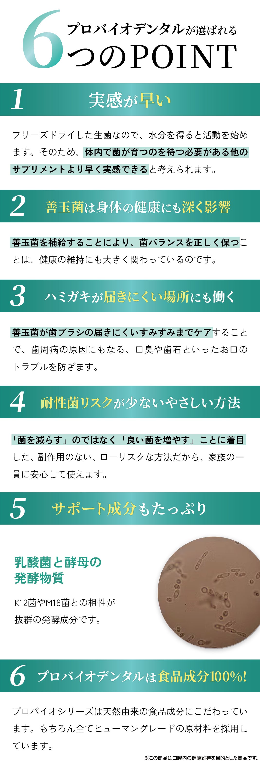 そこで「プロバイオシリーズ」は、善玉菌を補い、口腔内の菌バランスを整えるサポートをします。善玉菌を増やすことで悪玉菌の増殖を抑え、健康な口内環境を維持する効果が期待できます。