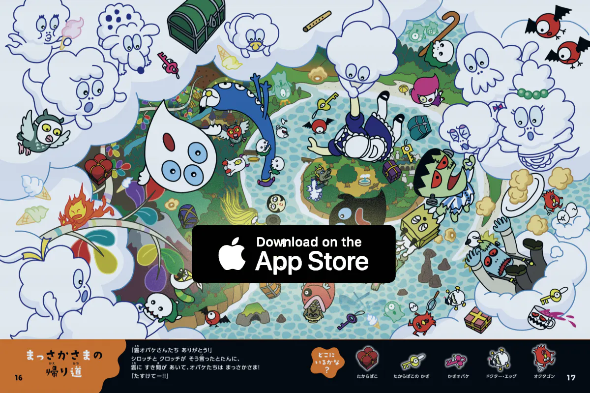 実はオバケファンのみなさま向けにAppStoreにアプリもあります。絵本を読んでくれて、絵さがしもできます。もちろん迷路もあります。絵探しは本よりも難しく、一回ではクリアできない仕組みになっています。第一弾と第2弾、2つセットでお届けします!