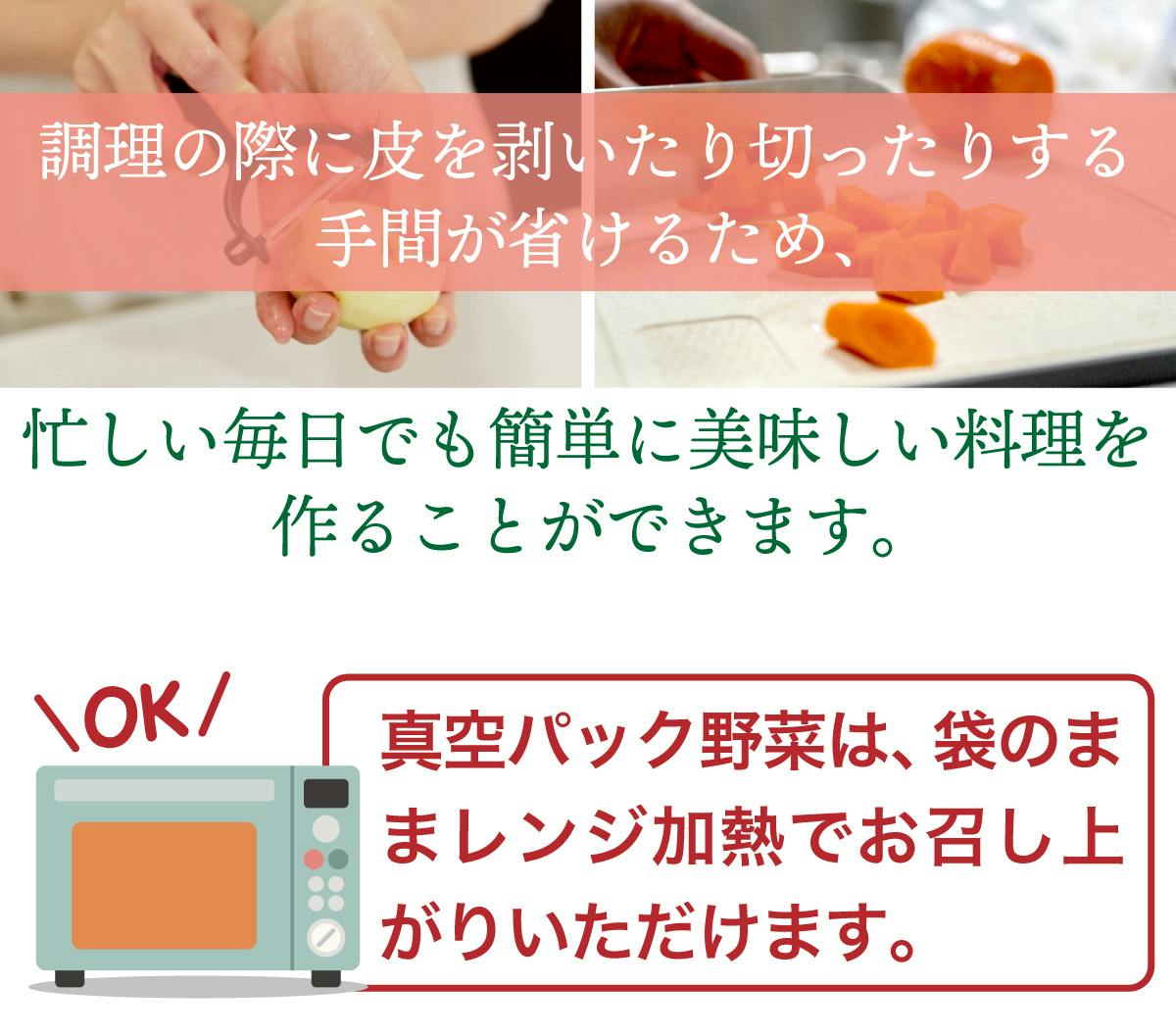 真空パック野菜は、袋のままレンジ加熱でお召し上がりいただけます。