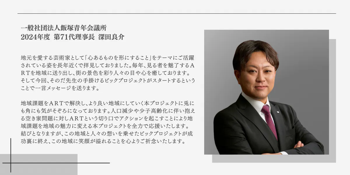 これまで私たちは、地域に根付いた文化向上と、アートの力によって飯塚市の観光と地域活性を図る芸術運動として、たくさんの方々のご協力をいただきながらオブジェを各地に設置してきました。