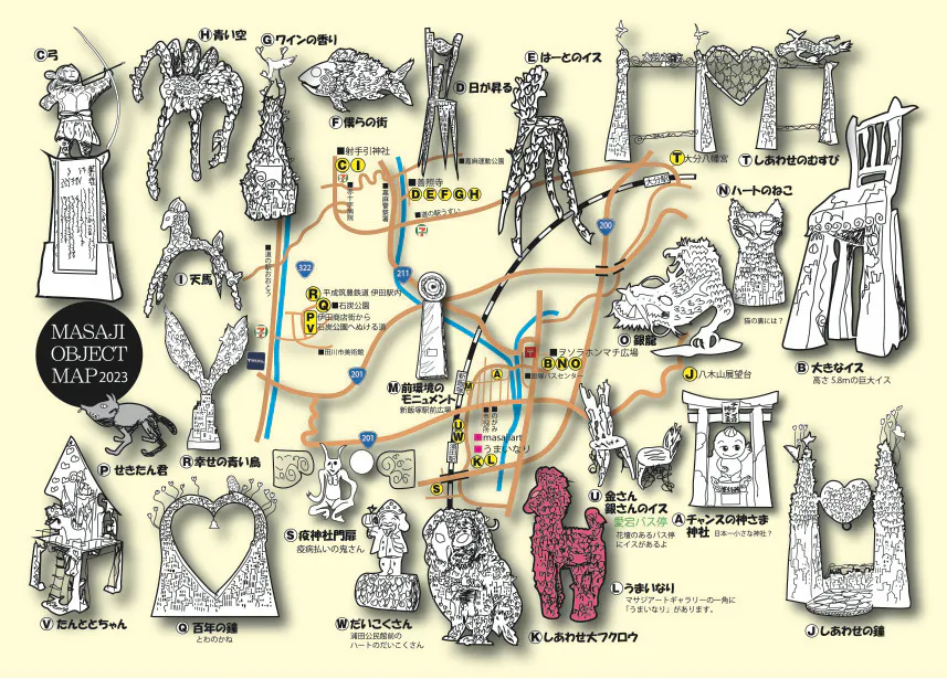 当初はアートを観て、触れて、体験する中で、豊かな心が育つ街になったらいいなと、ギャラリーで様々な展覧会を企画しました。そして、21年前からは、いつでも観られる屋外にオブジェを設置(写真:大きないす/2003年作)。約20年間でオブジェの数は20点以上になりました(写真:アートマップ)。
