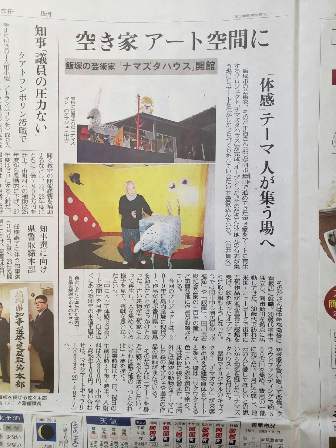 私たちのアトリエ「マサジアートギャラリー」(福岡県飯塚市鯰田2299-5)から、歩いて2~3分のところに、築90年の廃墟と化した空き家があります。その空き家を、できるだけその家屋の形や置かれたものを活かしながら、一軒丸ごとアートの空間「ナマズタハウス」にします。
