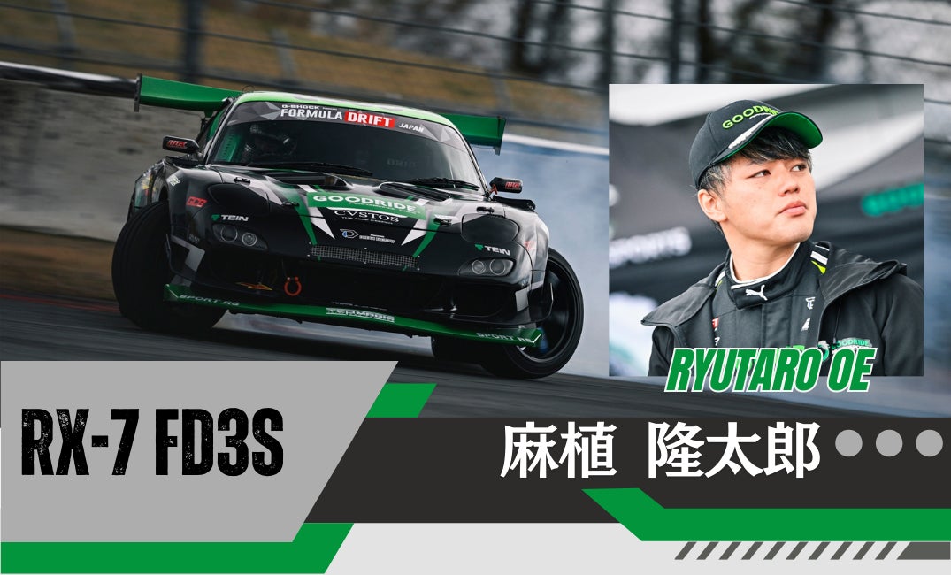 今シーズンよりチームGOODRIDEMOTORSPORTSからFORMULADRIFTJAPANに参戦させて頂く事になりました麻植隆太郎です。車両は昨年に引き続きFD3Sを使用し、1年戦って見えた良い部分を伸ばせるよう現在アップデートを行っています。自身3年目となる勝負のシーズンでこの様な体制で参戦出来る事に感謝し、結果で恩返しできるよう個人表彰台を目指すと共にチーム力を活かしGOODRIDE表彰台独占を目標にして戦って行きます。 応援宜しくお願いします。