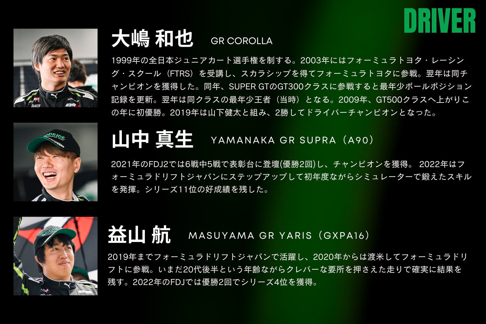 ワークスドライバーには2021年にFDJ2でシリーズチャンピオンを獲得した⼭中真⽣、アメリカのフォーミュラドリフトでも活躍している益⼭航を迎え、 セミワークスドライバーには堀野仁と⾬⾕雄⼀というベテランを抜擢。