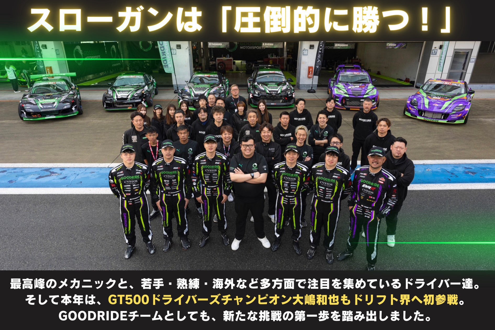 このプロジェクトを通じて、ドリフト競技の素晴らしさをより多くの人に伝え、共感していただくことがGOODRIDEMOTORSPORTSの願いです。一緒にドリフト競技の魅力を広めていくために、ご協力いただけますと幸いです!
