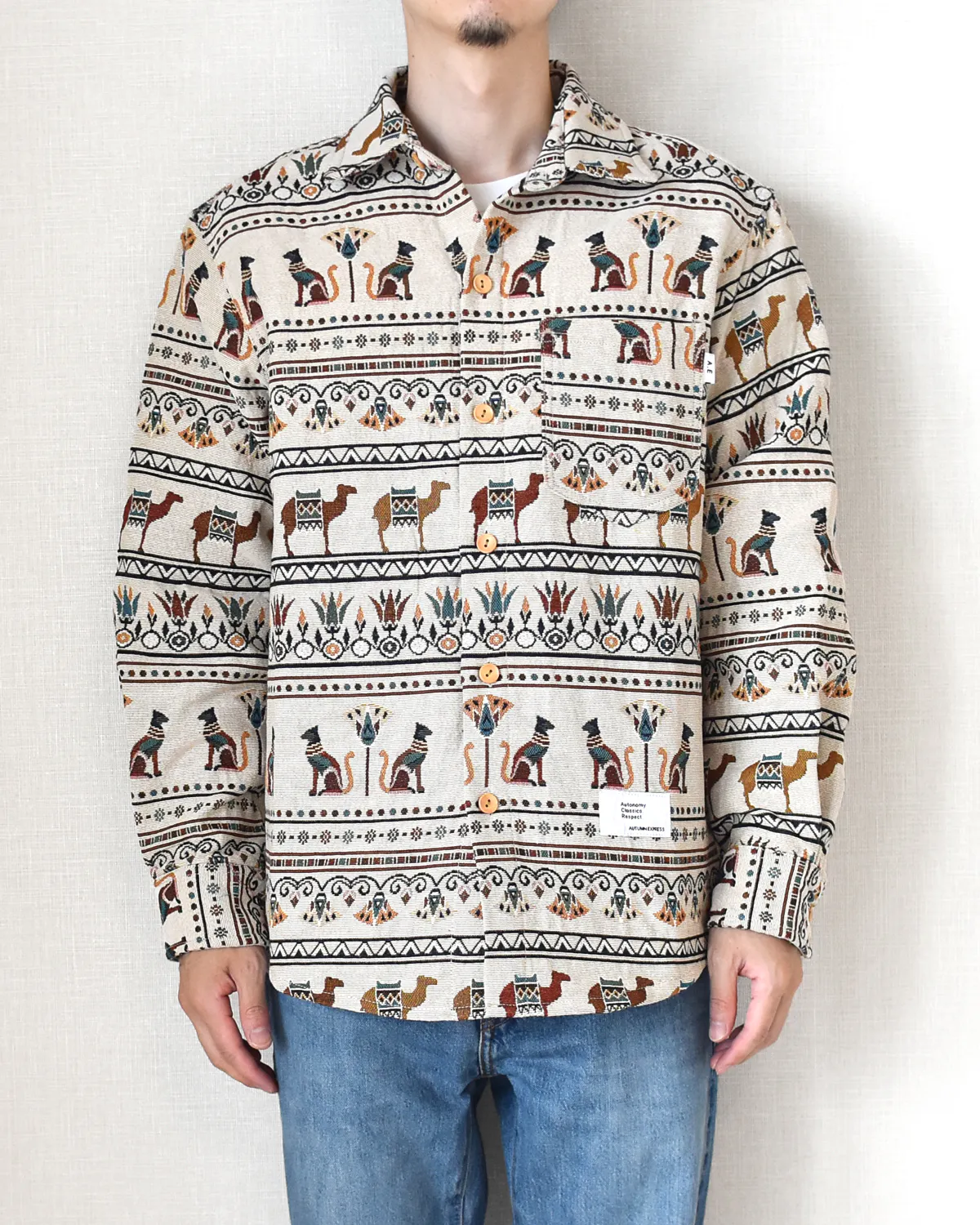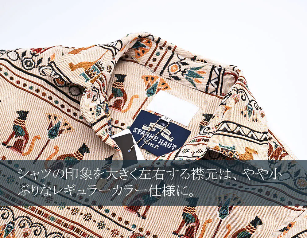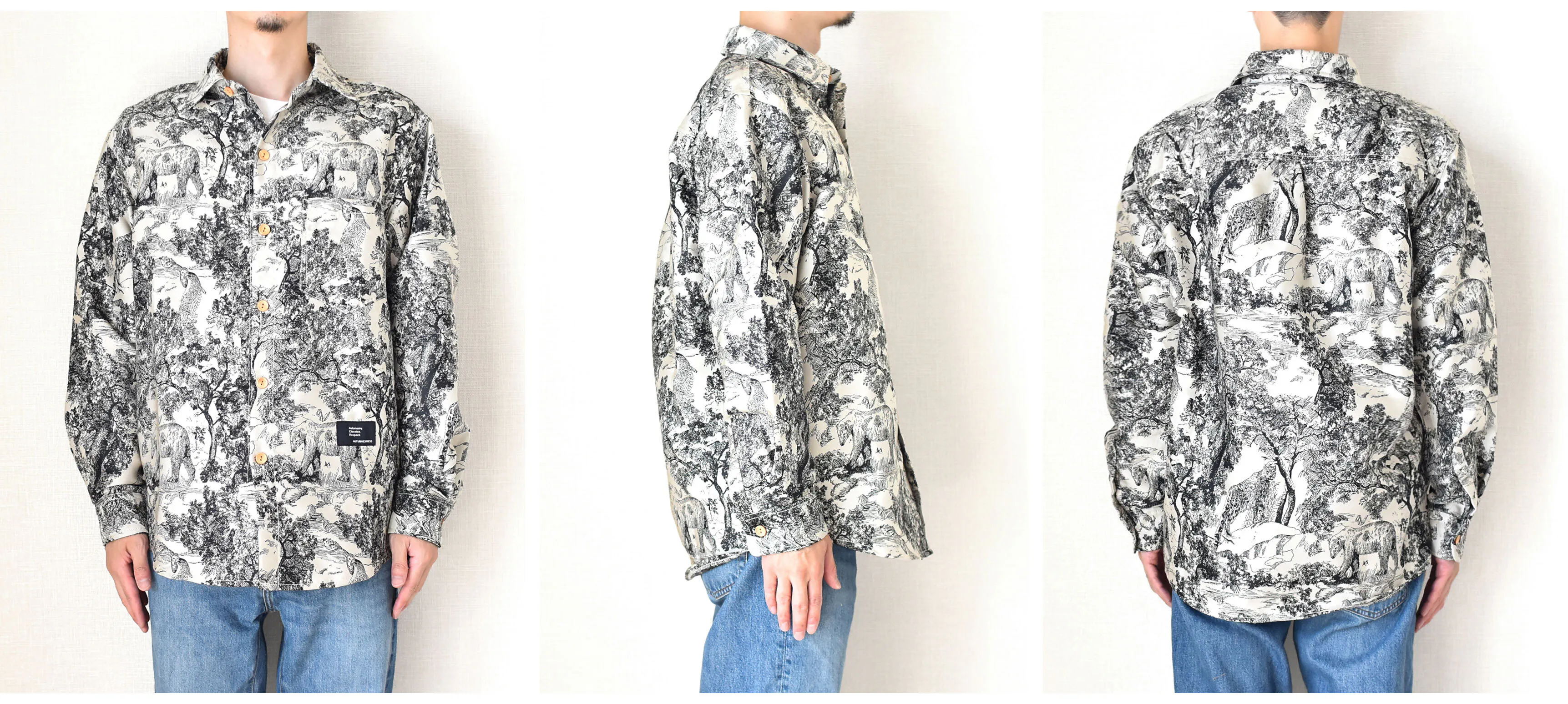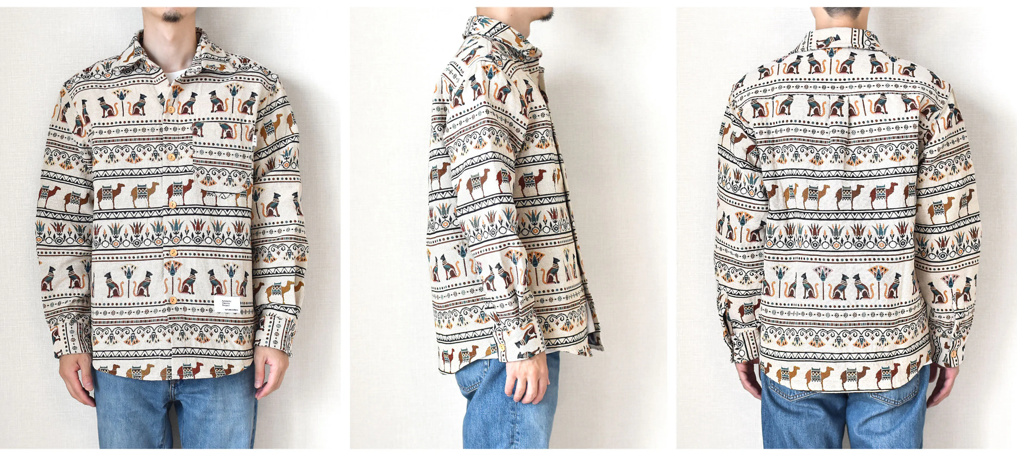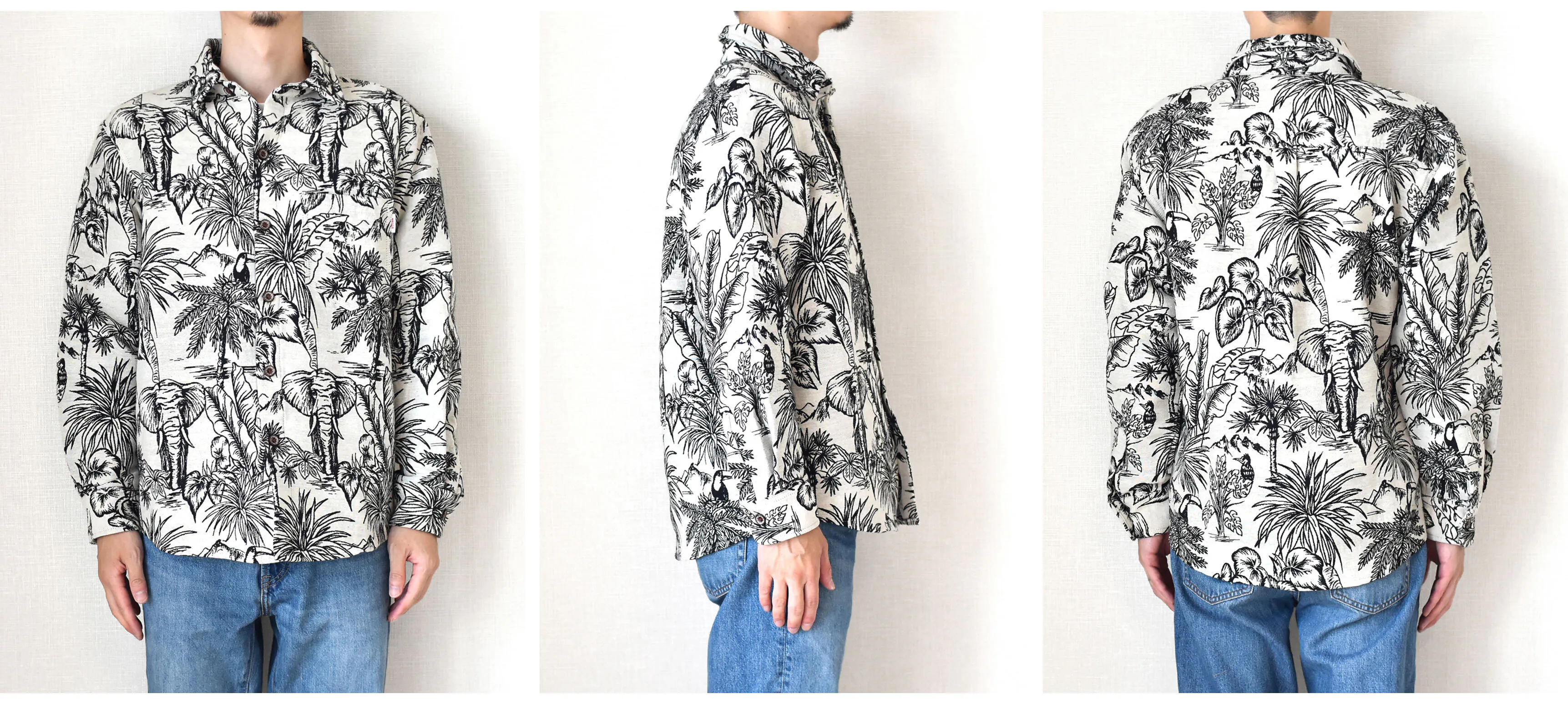 今回リリースする総柄ロングスリーブシャツ、ボタニカル柄、サバンナ柄、ジャングル柄、エスニック柄、エジプト柄と5つの柄で展開しています。